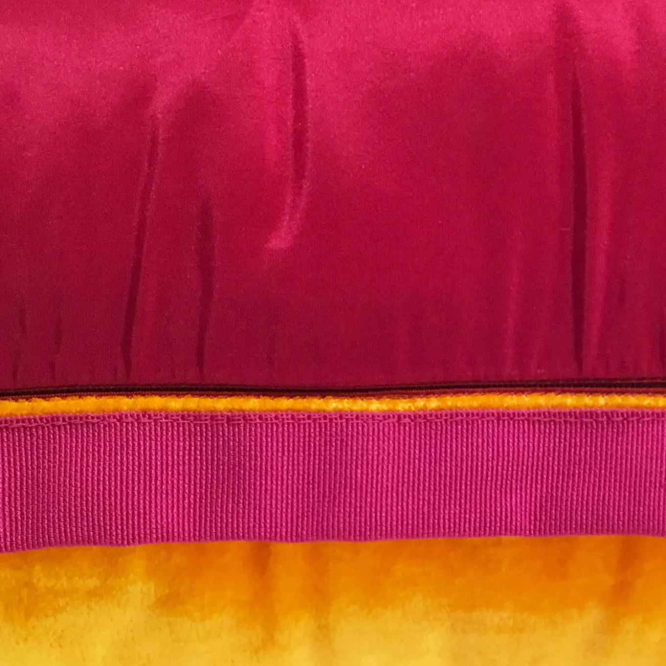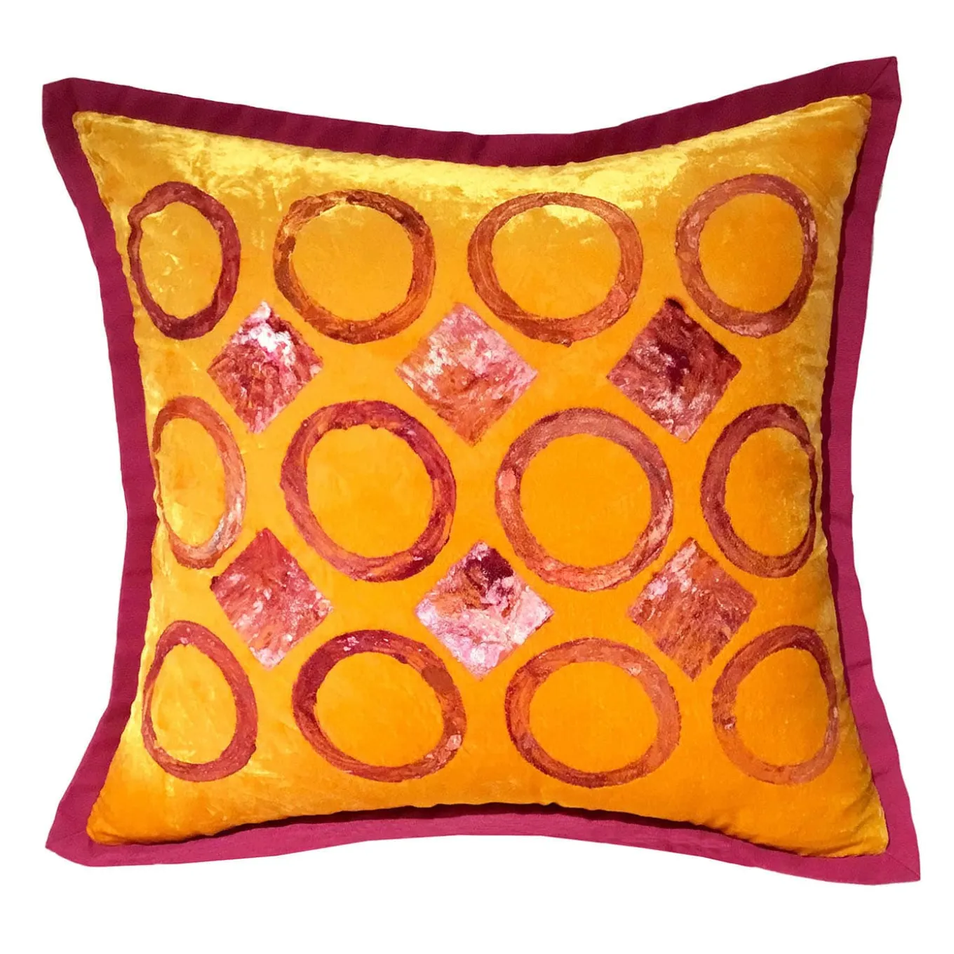 Experience the artistry of these silk velvet pillows, where the rich heritage of Venetian tapestry meets modern design sensibilities. Each pillow is meticulously handcrafted, with natural pigments used to create deep, vibrant colors. This pillow showcases a striking geometric pattern of pink and red circles against a warm orange canvas, highlighting the sumptuous texture of the velvet. A truly captivating addition to any space.