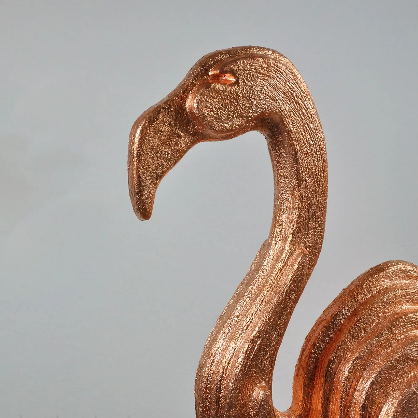 Flamingos and their poetic frailty inspired this stunning zoomorphic sculpture in extruded polyurethane, its streamlined stem standing for the birds’ signature extra-thin and elongated legs. Fitted to a raw iron base, the body of the flamingo is finished with an application of plaster on relief and precious copper leaf for a striking interplay of shimmers resulting emphasized when the piece is hit by the light.