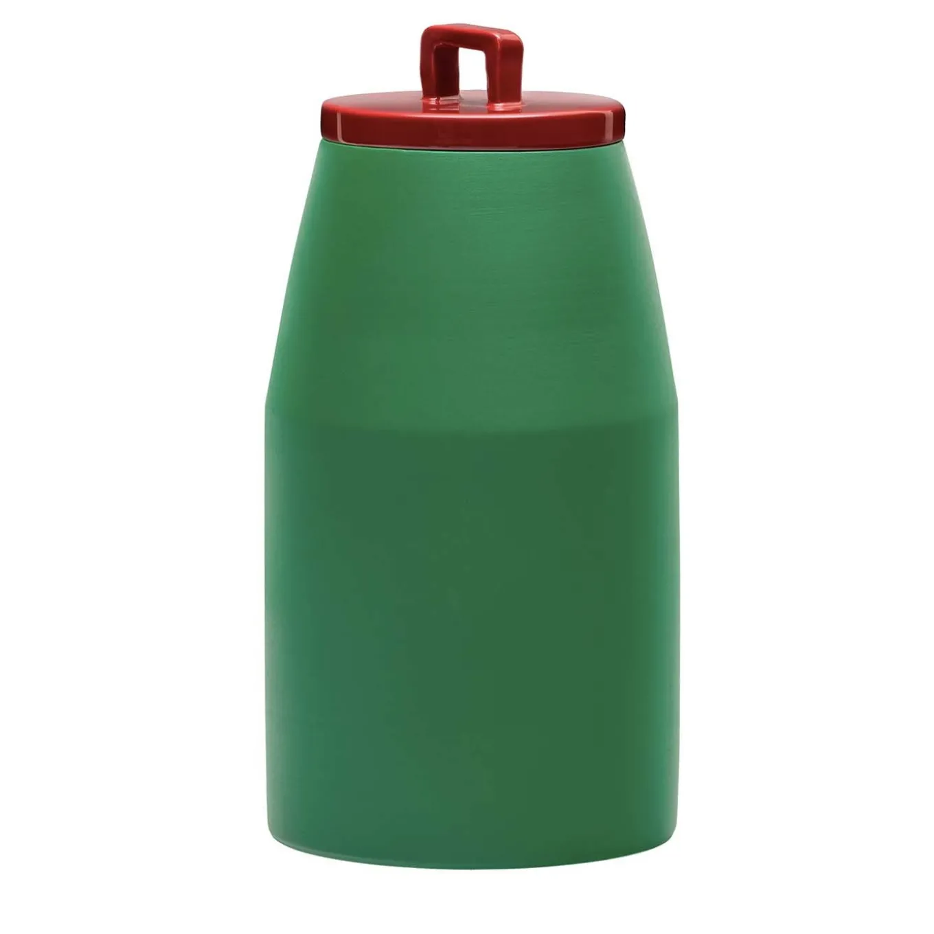 Inspired by the shape of old vessels used in antiquity to store wine and grains, this vase with lid makes a statement-making piece in a modern interior. This simple yet elegant design by Nathalie Du Pasquier (2018) features a smooth-textured body in a vivid jade-green color with a slightly tapered neck. The red circular lid is accented with a U-shaped handle, a chromatic contrast that creates visual interest. Materialism Collection.