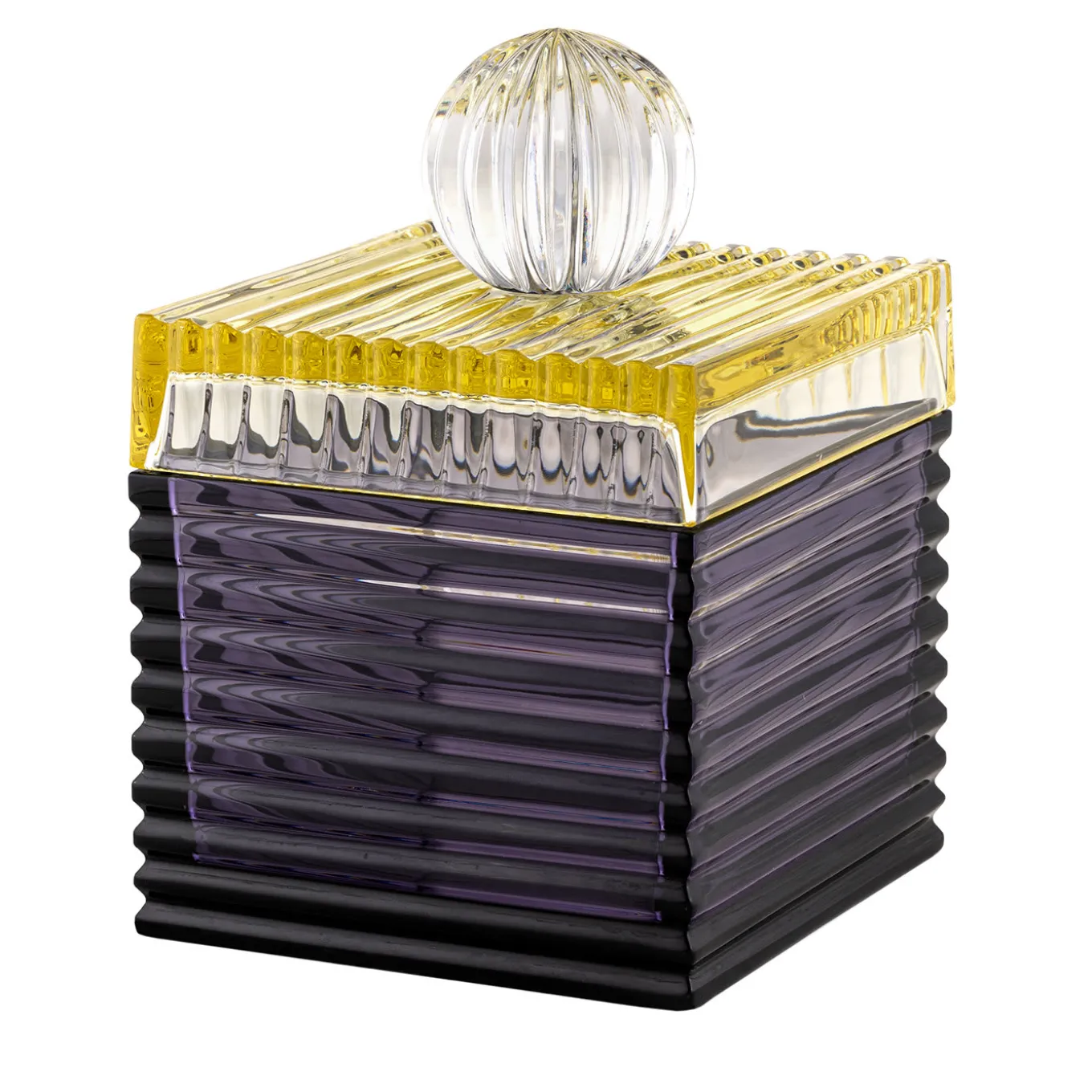 Mysterious and elegant with a playful personality, this crystal box with lid is marked by an impactful aesthetic, ideal to keep accessory favorites organized in a luxury case. An intriguing fluted texture characterizes the whole box, from the purple-hued body, to the clear lid equipped with spherical finial featuring edges accented in yellow for a lively chromatic twist.