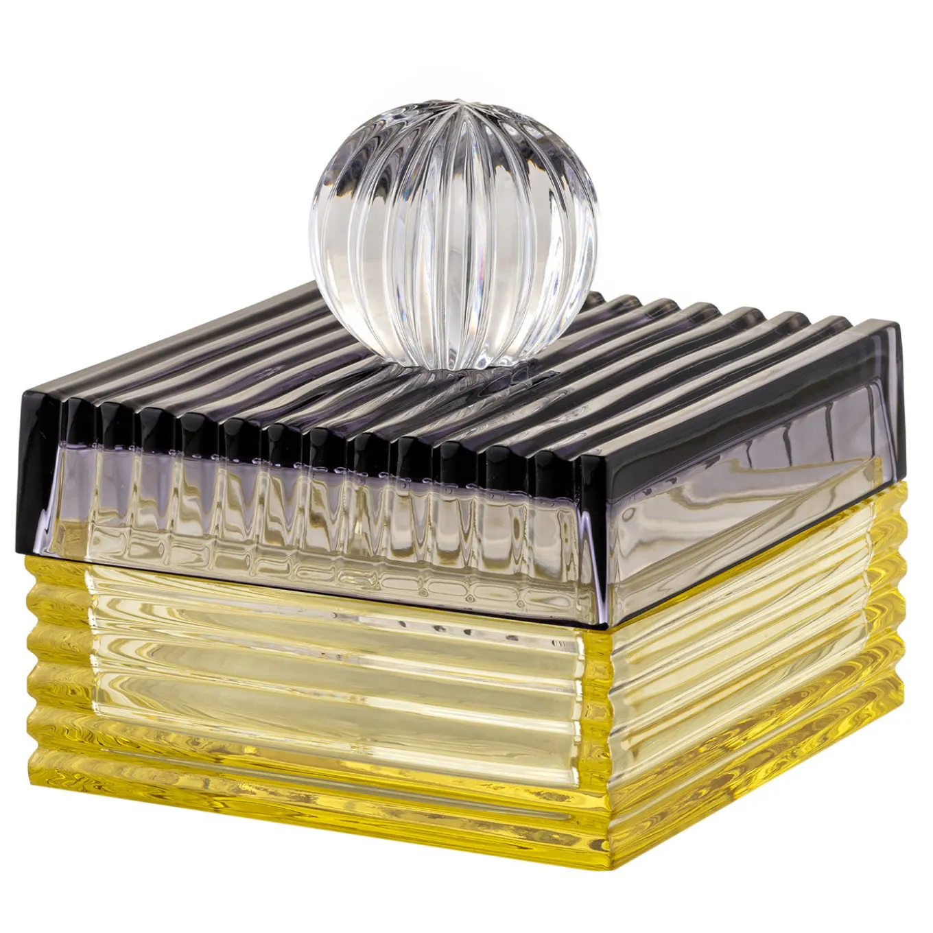 Extensively marked by an eye-catching fluted texture, this squared box showcases the playful potential of fine crystal, making it an impeccable addition to refined contemporary decors. Each structural component features a different shade, yellow for the container, gray for the lid, and clear for the spherical finial.