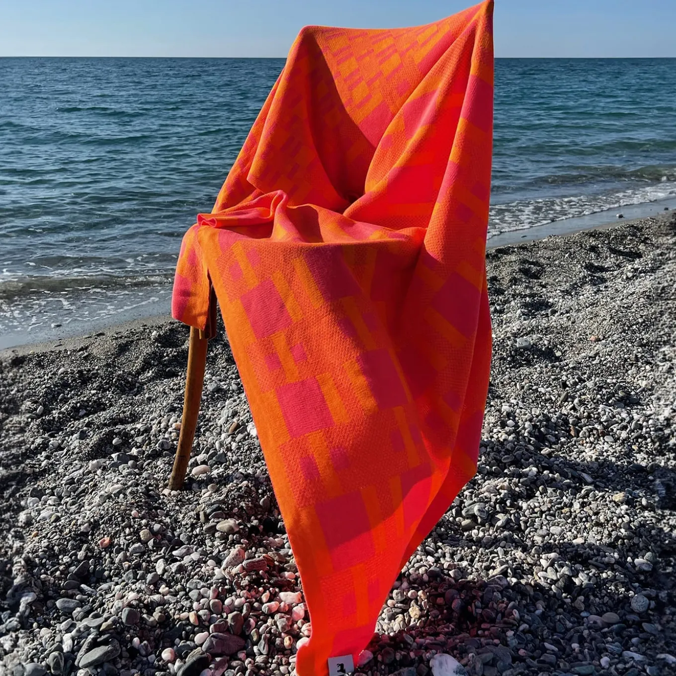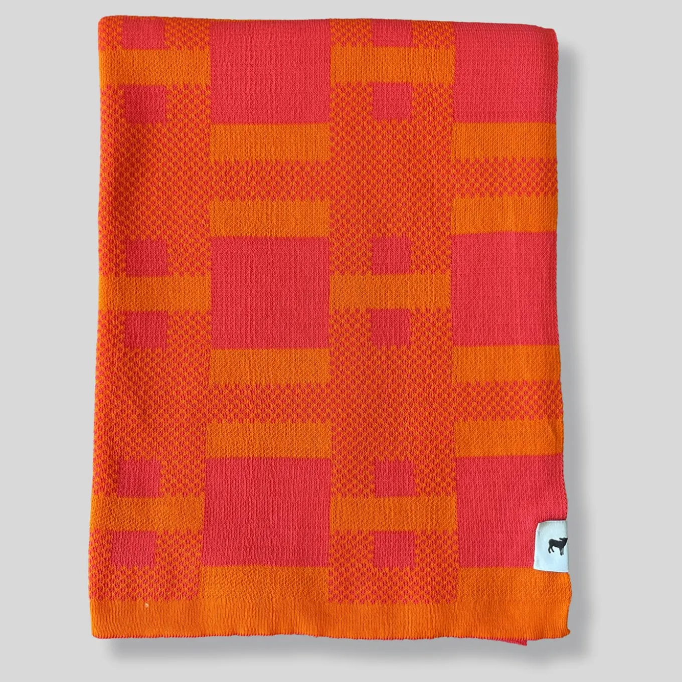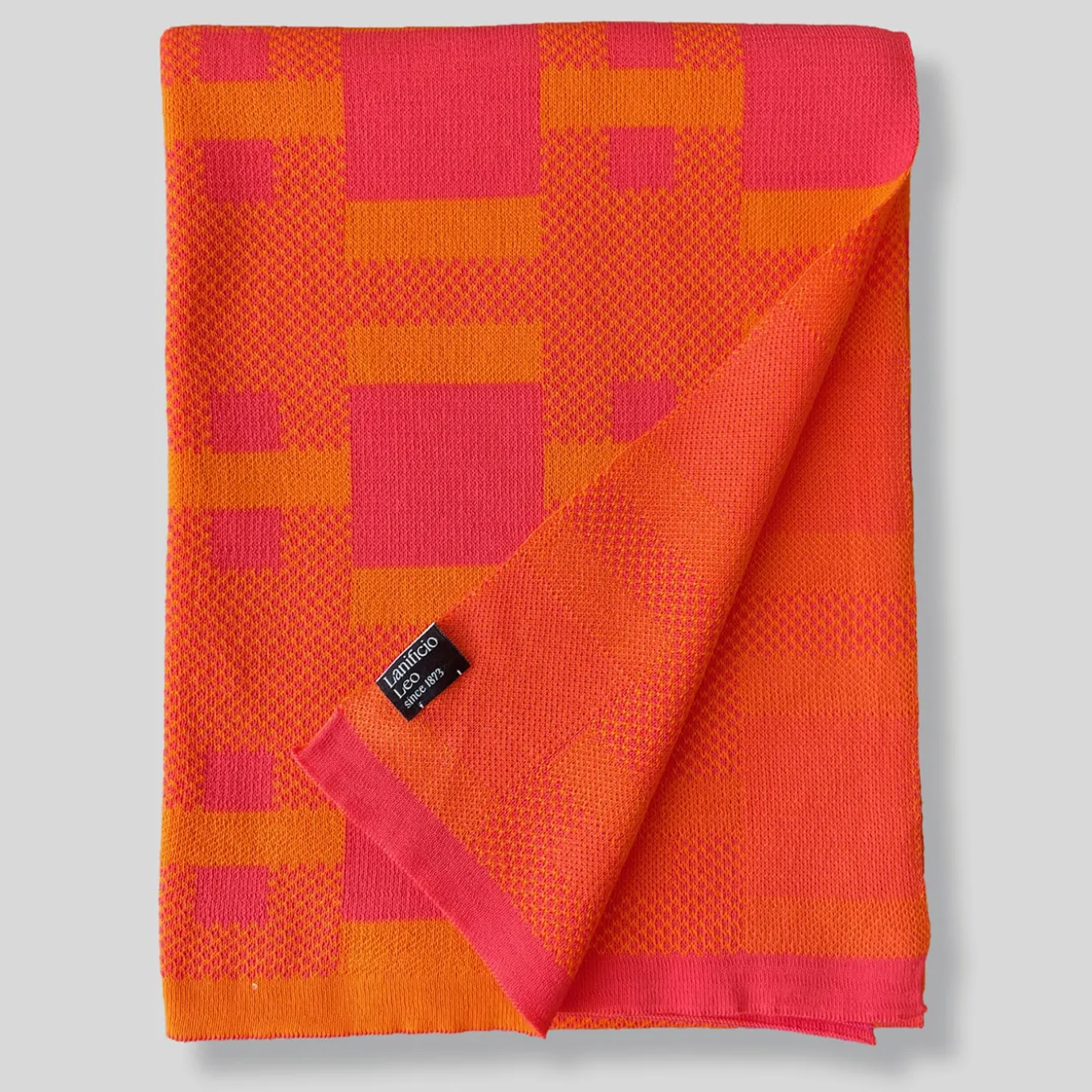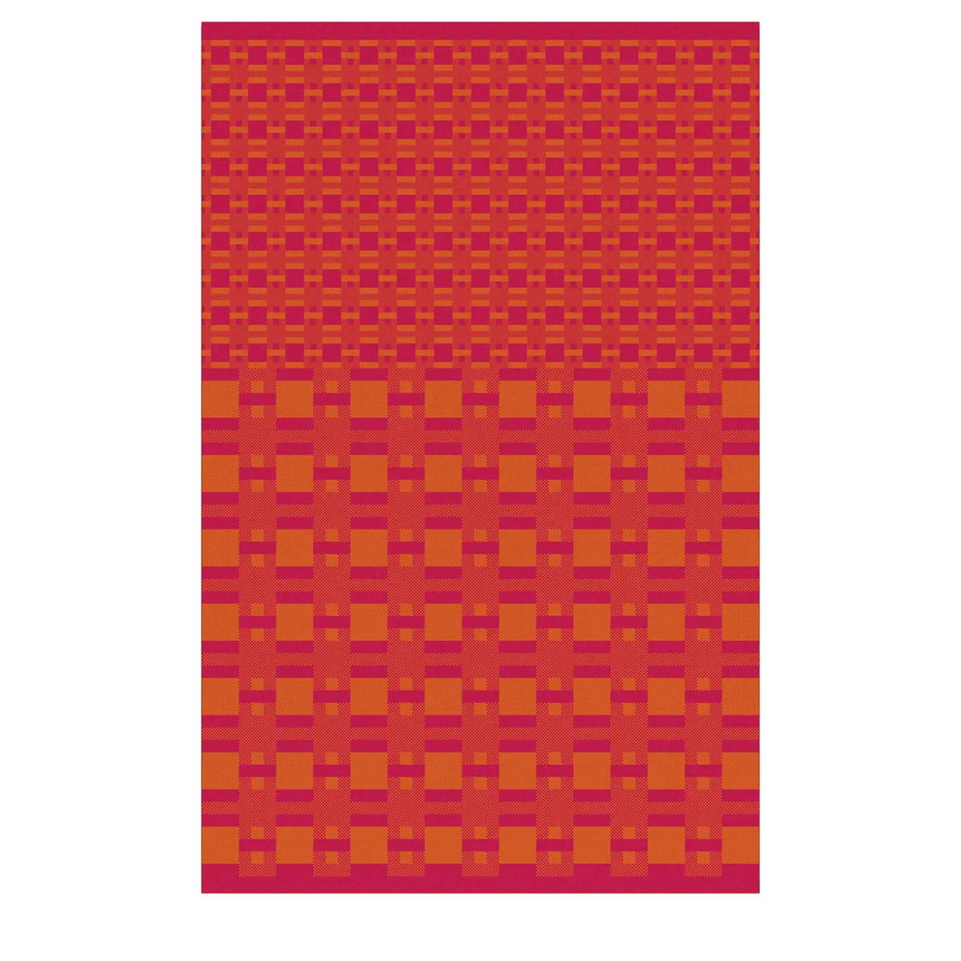 Vibrant shades of orange and red are the ones selected for this stylish jacquard piqué-weft blanket, a precious piece obtained from the weaving of fine bio four-ply cotton yarns. The characteristic pattern it flaunts belongs to a computational project where graphic motifs are randomly generated using a Max/MSP code. A yellow version is also available in the Artemest catalog.