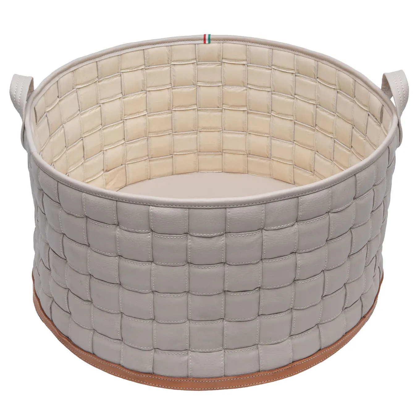 Knotted from cream-toned faux-leather bands into an elegant reticular design, this round-cut basket is as appealing to the eye as it is to the touch. Tiny feet attached to the solid round base raise the basket from the ground, maximizing its resistance and maintaining its beauty untouched overtime. A perfect synthesis of aesthetics and functionality, it is available in multiple size and color options.