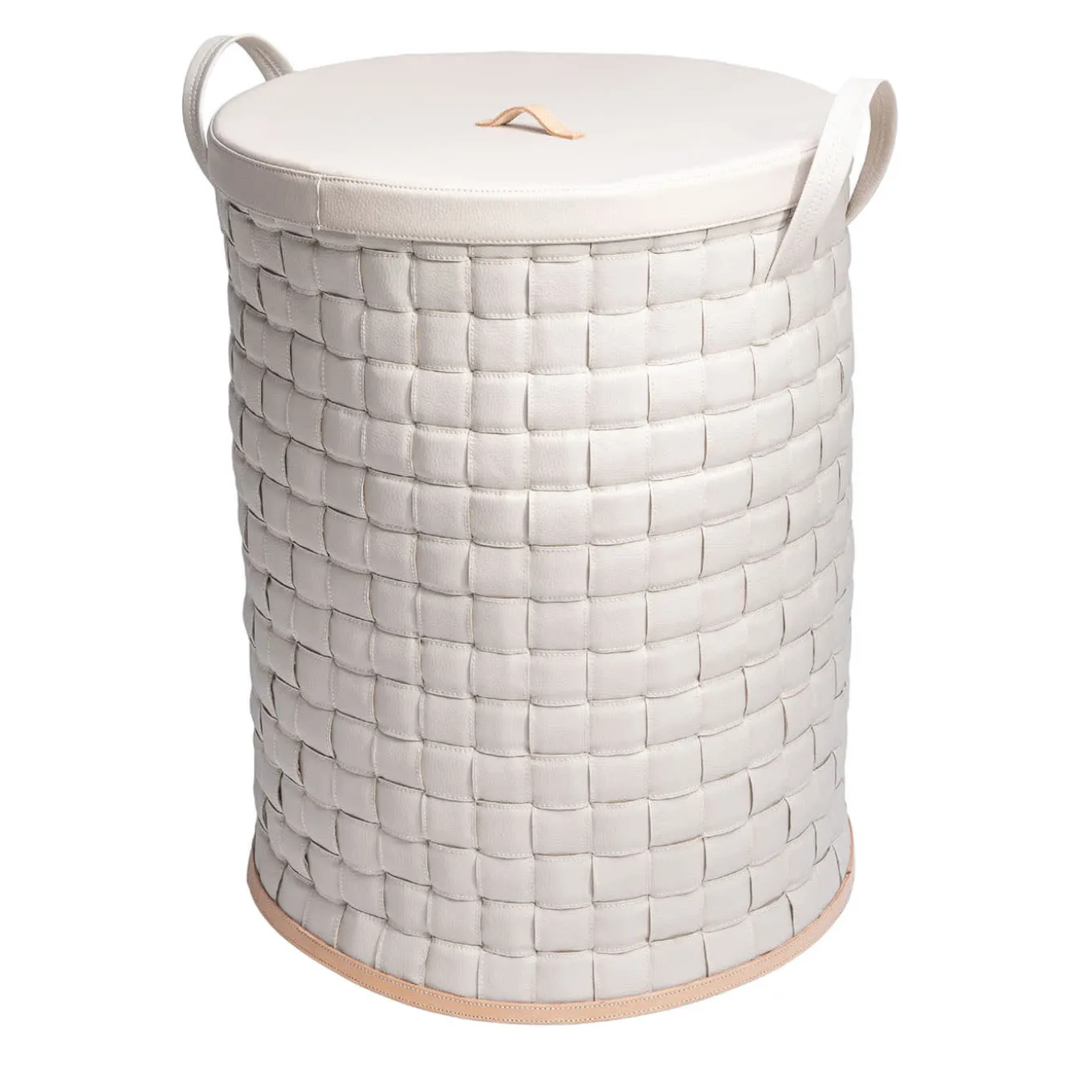 The neatness of a regularly knotted design encounters the subtle luminosity of cream faux leather in this elegant laundry basket. Fitted to a solid base, tiny feet raise the cylindrical silhouette from the ground, keeping it safe from dirt and humidity. Equipped with coordinated handles and a lid, the design maximizes practicality while favoring privacy and always putting sartorial elegance at the forefront. Different sizes and colors are available.