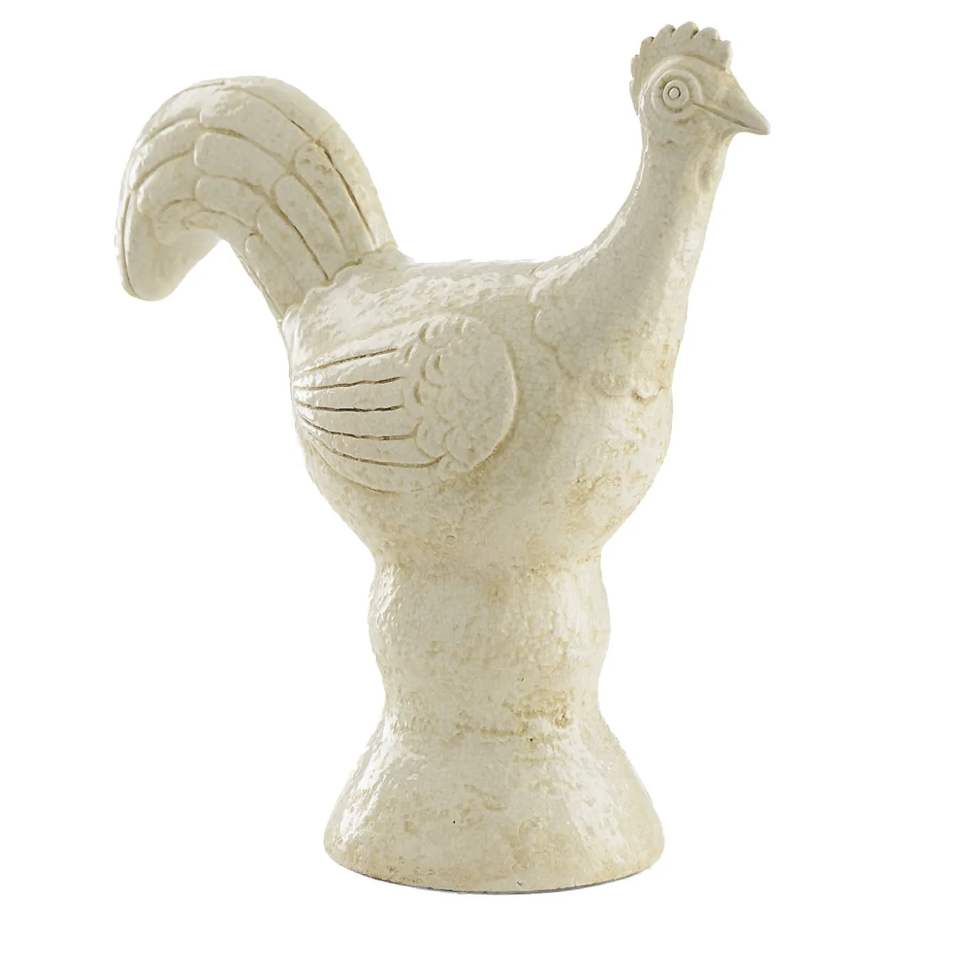 Exceptional showcase of traditional craftsmanship, this striking ceramic sculpture exudes refinement and rustic charm. A stylized depiction of a chicken, this piece is distinctive for its use of etching to form the delicate lines of the bold eyes, comb, and prominent tail of the bird. The unglazed finish reveals a natural ceramic color that highlights the white etchings, which seemingly emerge from the stone to create a stunning visual effect. The entire composition rests atop a stately hourglass pedestal.
