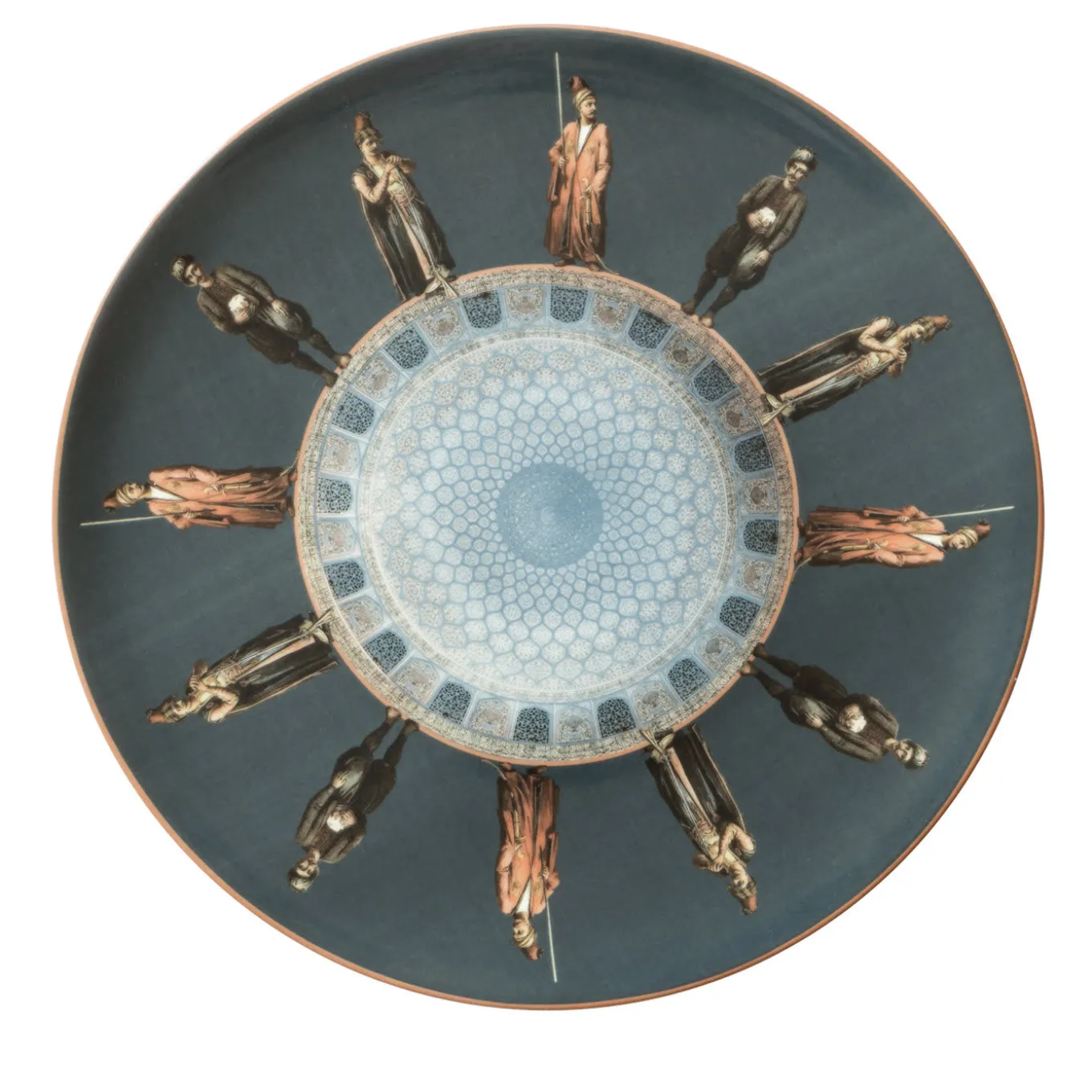 This magnificent porcelain plate was designed by Vito Nesta and inspired by the Ottoman empire and its capital. It is part of a limited series of six plates that can be mismatched obtaining a striking effect on the dinner table. Each design is made in a limited series of 100 pieces. In this case the elegant dark blue of the background is adorned with human figurines dressed in the fashion of Constantinople, while the center is exquisitely adorned with an abstract pale blue decoration.