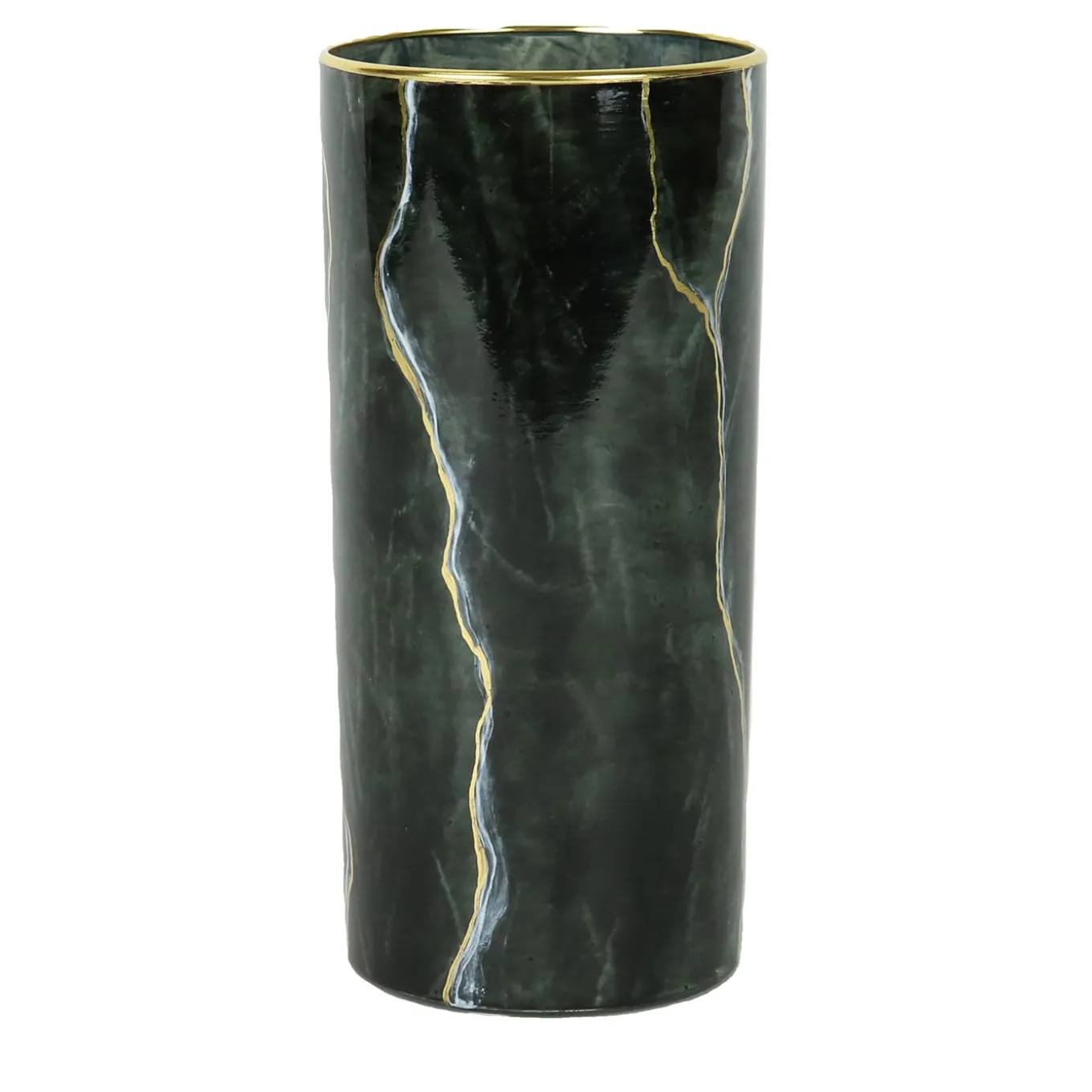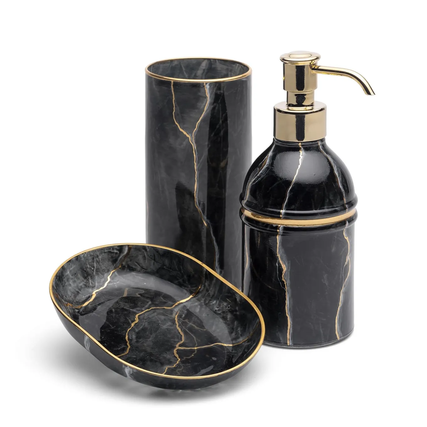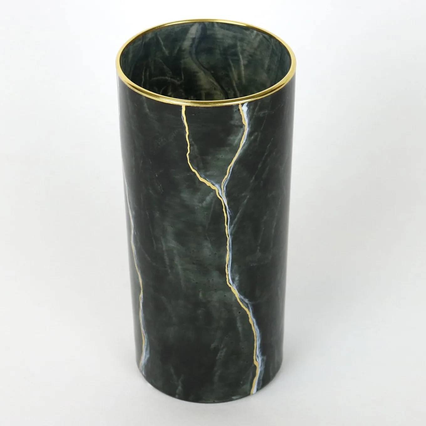 This tall tumbler exudes sophistication with its Portoro black marble-inspired design. Crafted from hand-blown glass, its sleek surface is enhanced with gold accents applied by hand, showcasing fine craftsmanship. Versatile in use, it functions as a vessel for beverages or as a toothbrush holder. Customizable with alternative marble-like designs, it adds a refined touch to bathrooms, vanities, or any elegant interior setting.