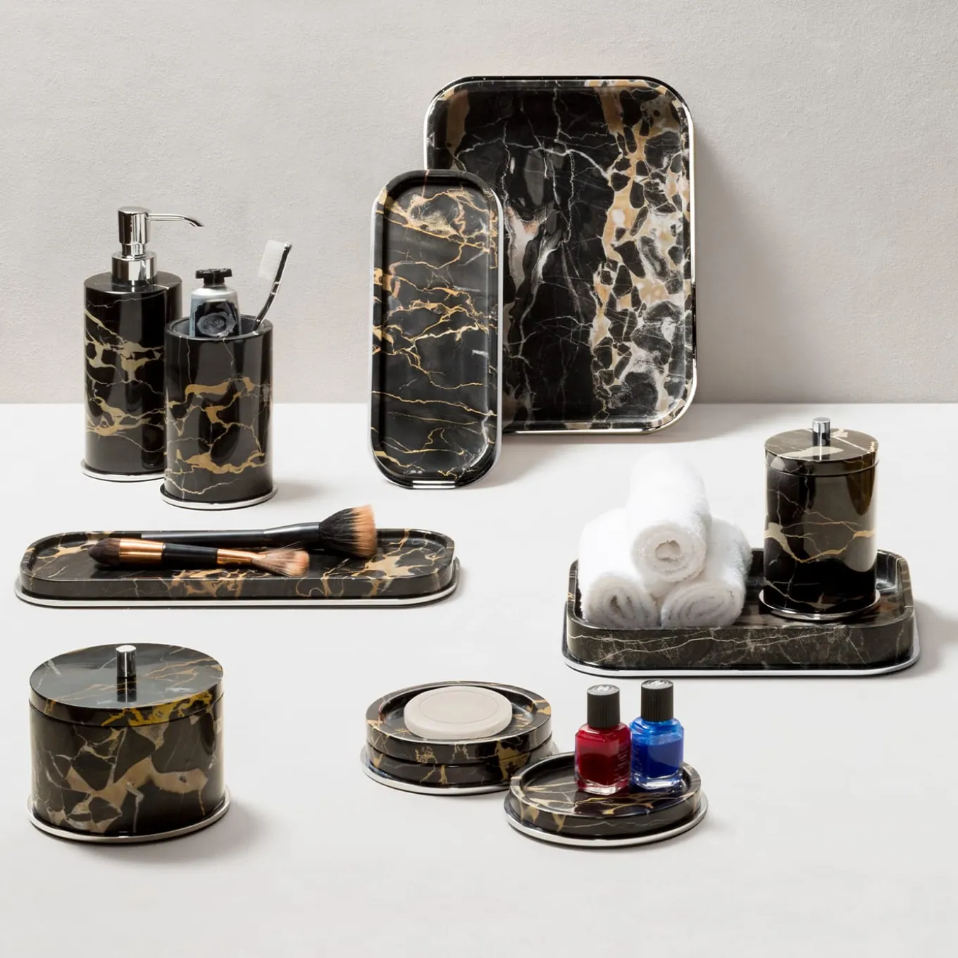 The Positano marble valet tray boasts metal details with different finishes -brushed bronze, brushed brass, and polished chrome- that enhance each piece. Every stone used to bring a Positano marble set to life is different from the other, providing a unique, exclusive design to each creation. Marble structure with metal base frame and spout. Non-slip waterproof rubber base underneath. Marble finishes available arabescato white / green guatemala / bramosa brown / black portoro / travertino.