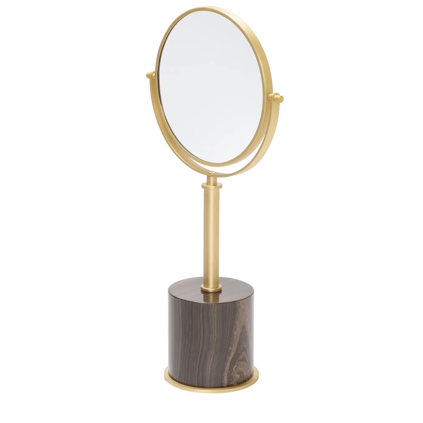 Metal structure available in different finishes featuring a heavy marble base that grants perfect stability. The mirror rotates for a choice of 2x magnification or standard reflection. Marble finishes available: Arabescato white / green Guatemala / Eramosa brown / black Portoro / Travertino. Metal finishes available: chrome / bronze / brass.