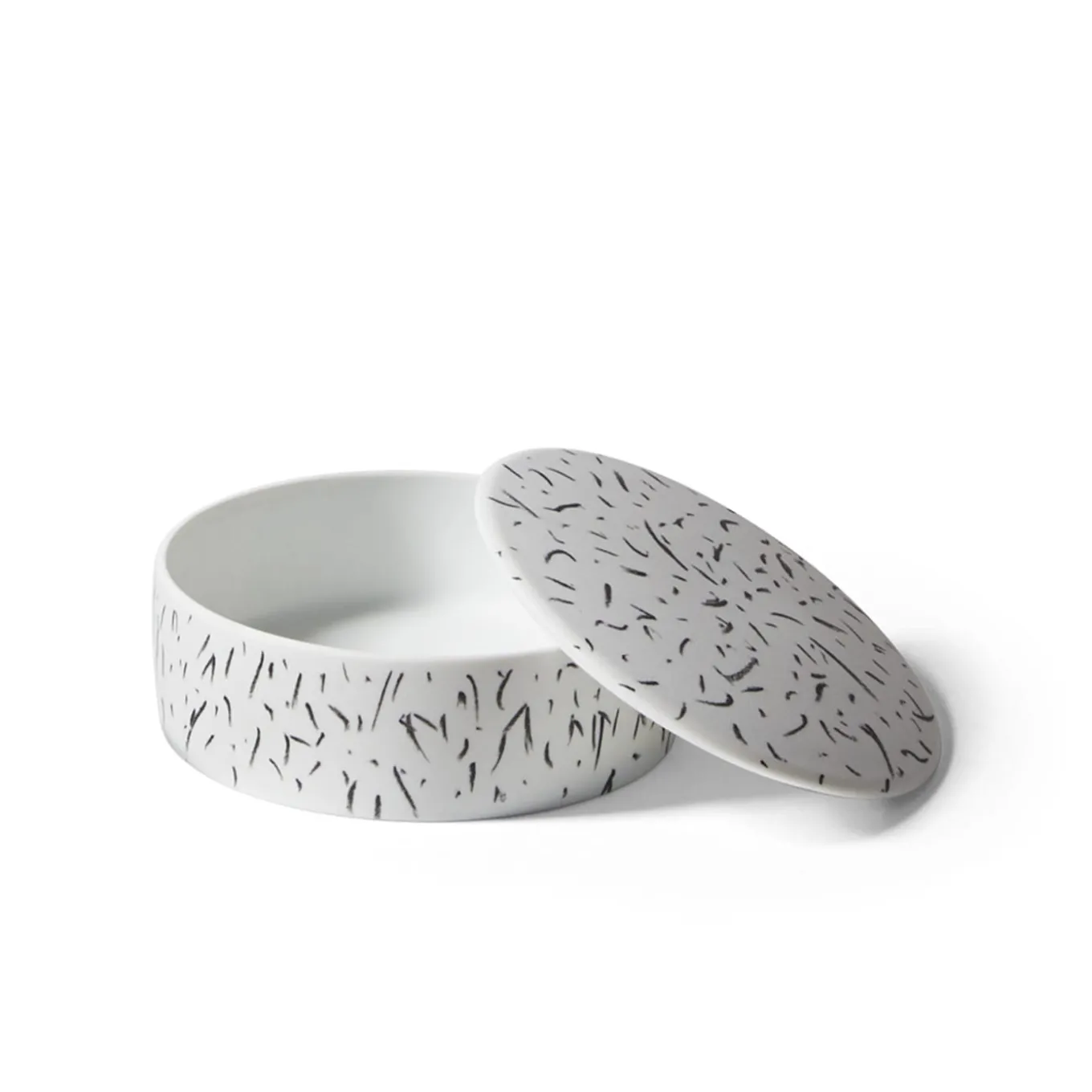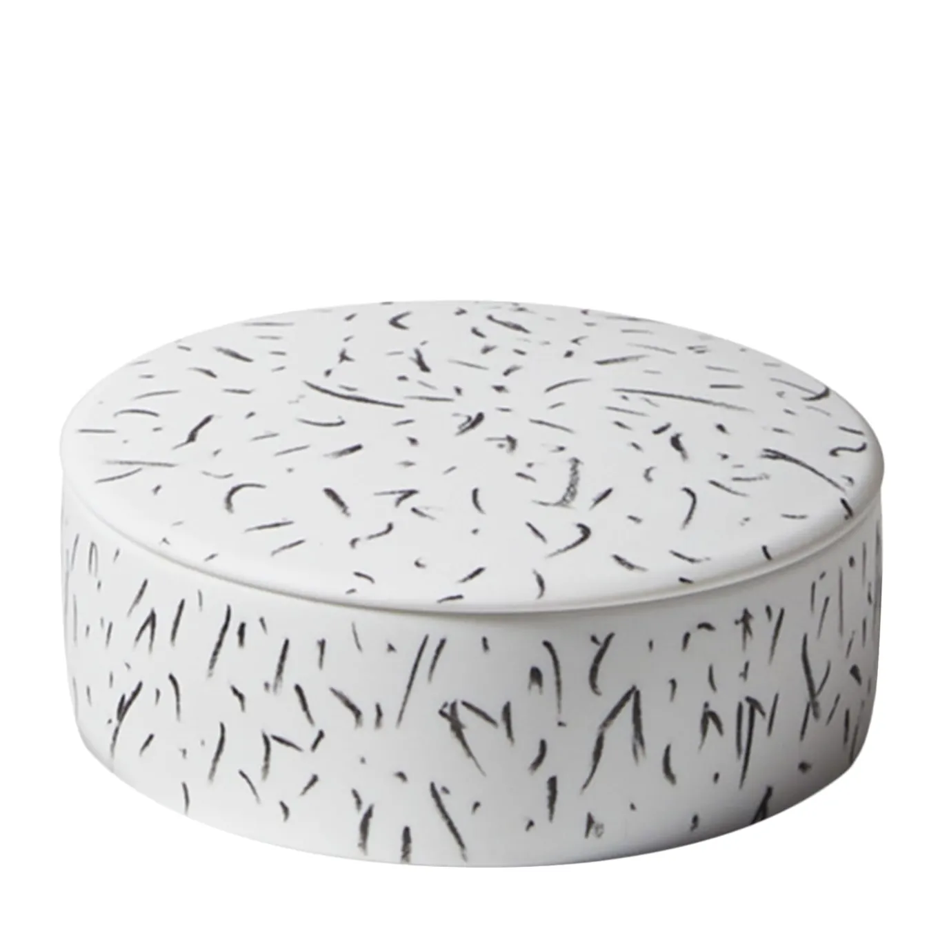 Simplicity and uniqueness merge in this tiny fine porcelain box, an exquisite solution for treasuring jewelry essentials. Designed by Formafantasma for the Post Scriptum Collection as a contemporary reinterpretation of timeless forms found in the Manifattura Ginori’s archive, it flaunts delicate black brushstrokes handpainted on its quiet round white silhouette, flat lid included.