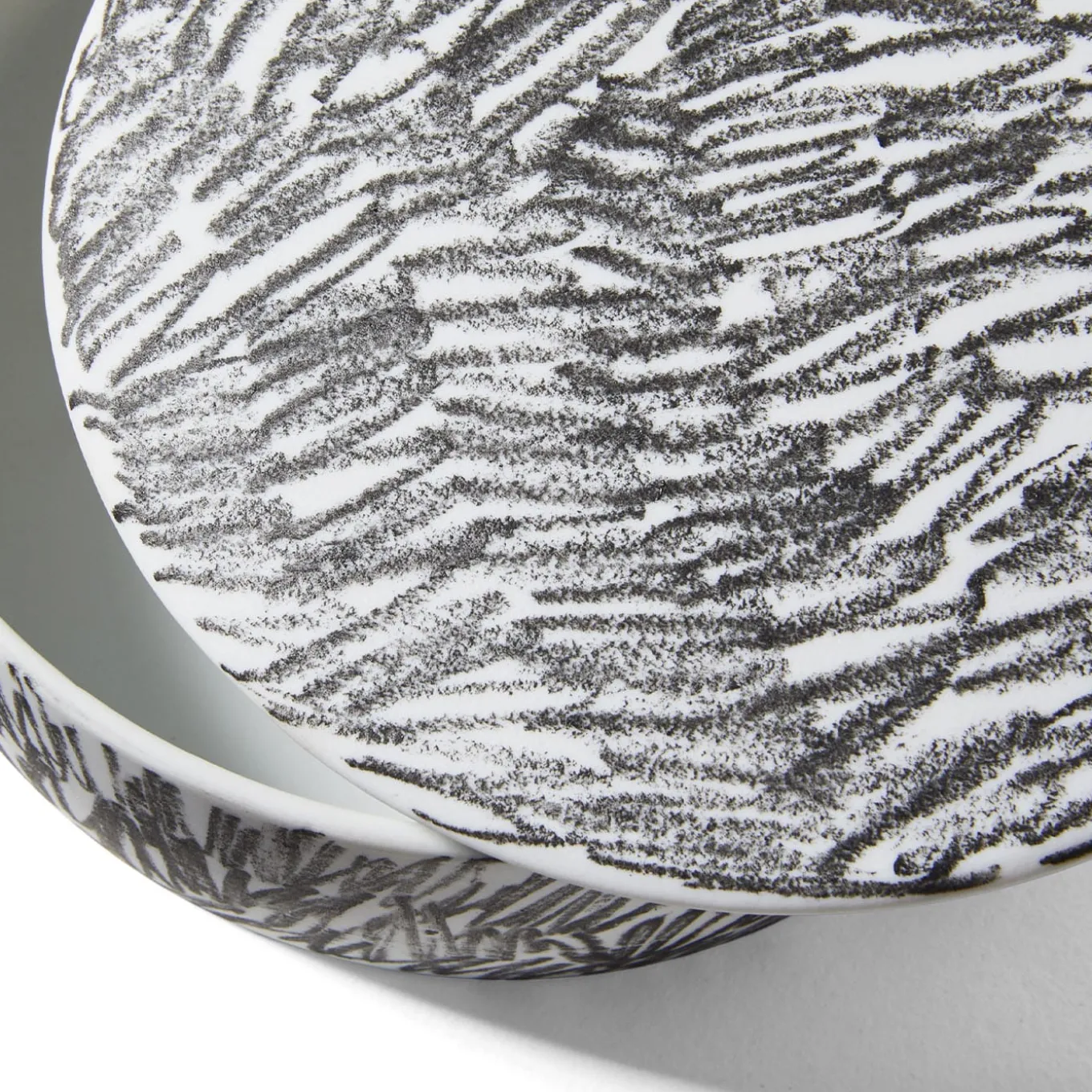 Designed by Formafantasma, this round porcelain box with lid is a refined contemporary reinterpretation of traditional forms found in Manifattura Ginori’s rich archive. Its extensive, scribble-like black motif results from the patient manual painting by master artisans, a process implying the uniqueness of every single piece from the Post Scriptum Collection.
