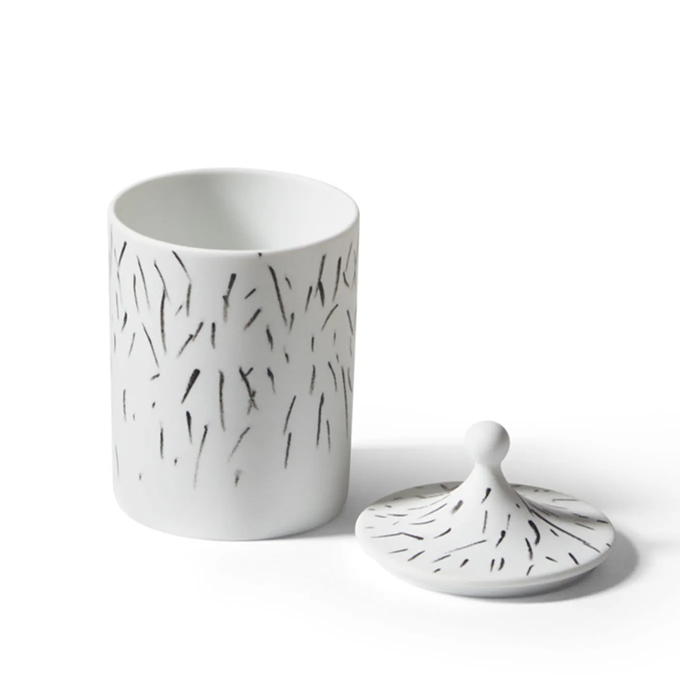 Archetypal shapes selected in the Manifattura Ginori’s archive and reinterpreted by Formafantasma in an exquisite contemporary key distinguish this precious porcelain candle holder with a lid. Black brushstrokes scattered on the exterior – including the lid with spherical finial – reveal the unique handpainted quality of the piece, a refined design from the Post Scriptum Collection.