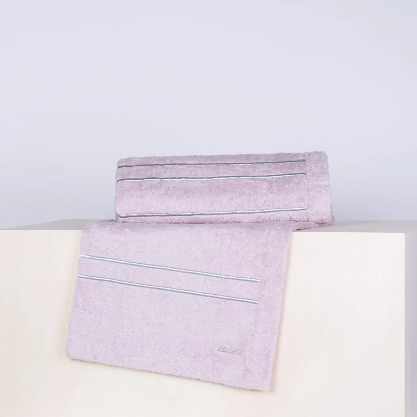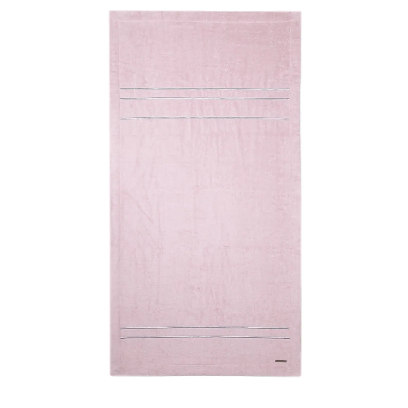 This elegant beach towel in powder pink is crafted in Egyptian cotton of the finest quality, accented by five silver embroideries in Lurex yarn that run across its surface. The metal logo plate has been embossed and sports a palladium finish.