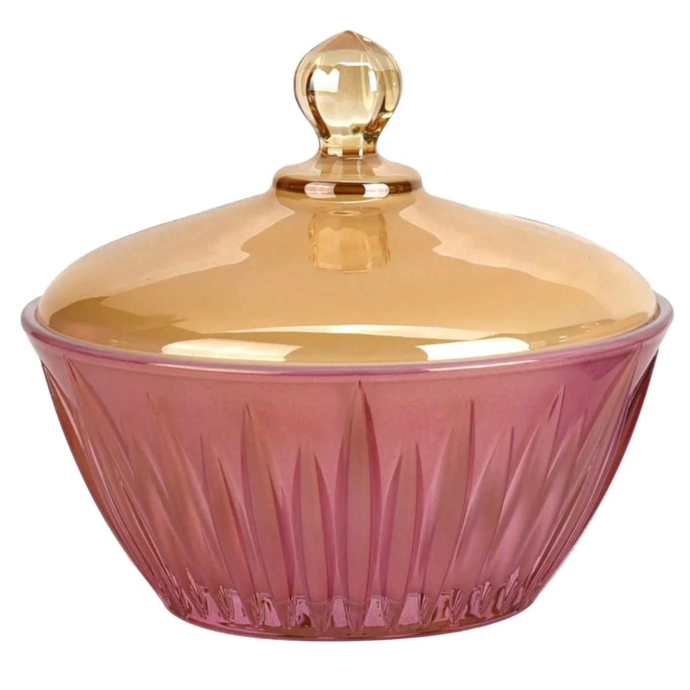 Aesthetic and practicality mark this superb box of the Prestigioso Collection of colored crystal pieces. This objet d’art is entirely decorated by hand and is composed of a pink bowl boasting vertical engravings and a refined yellow lid that enlivens it with a vivacious and elegant accent.
