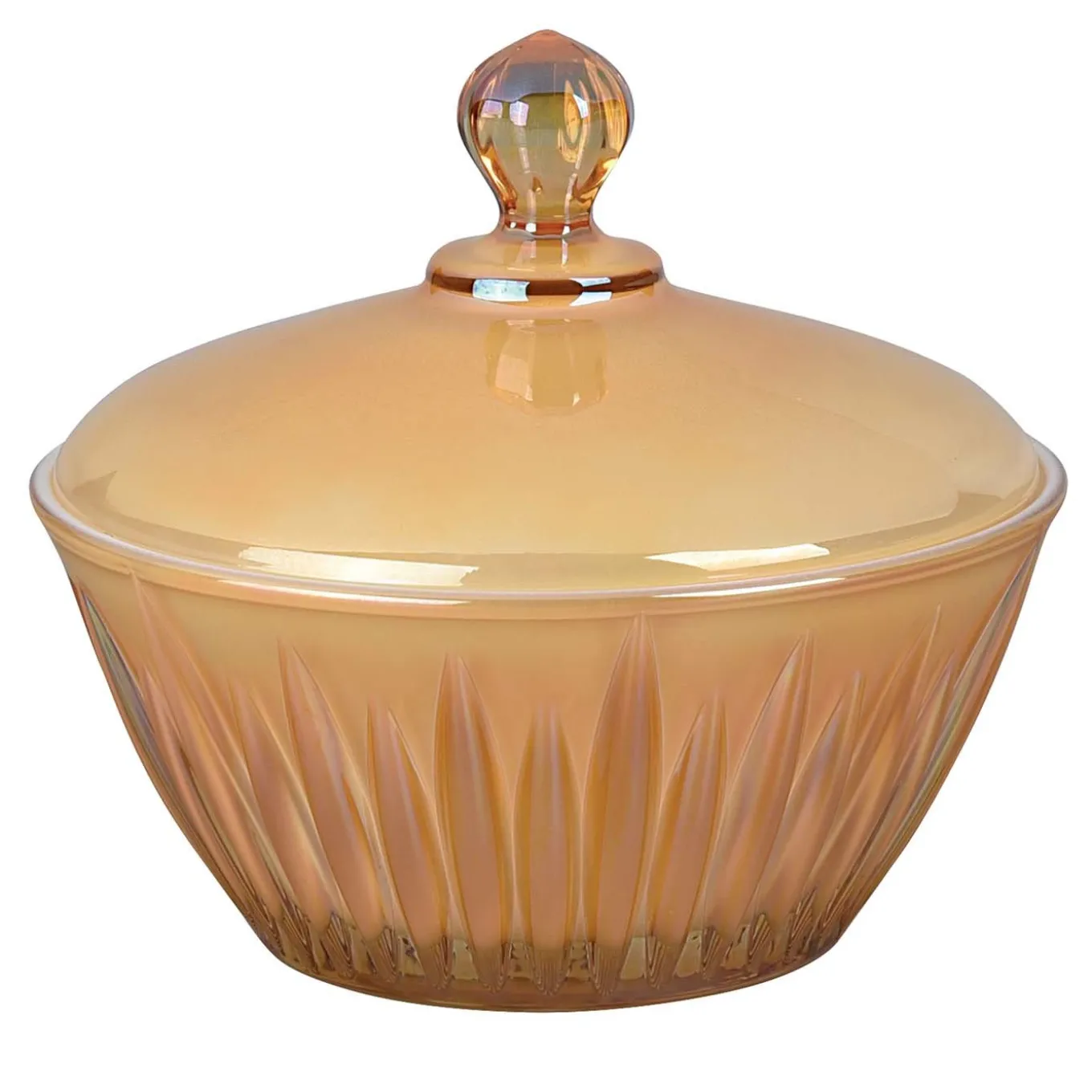 This superb box with lid is a versatile piece of decor that can be utilized in a variety of ways. Elegant and sophisticated, it is exquisitely handcrafted of crystal and decorated by hand in a warm yellow hue marked by vertical etched patterns on the bottom part of the bowl. The piece is completed with a transparent, yellow glass lid with a round finial.