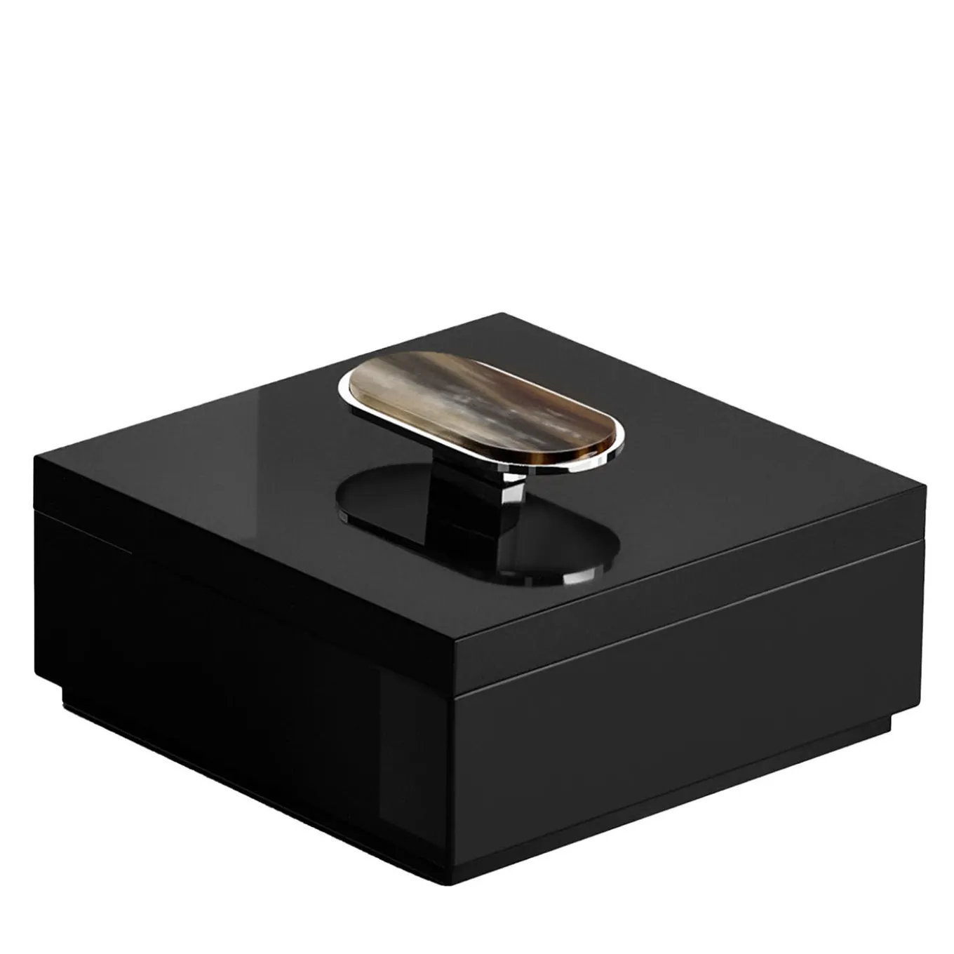 Sophisticated addition to a dresser or vanity, this box makes for a superb solution where to store jewel favorites. A glossy black finish of unfailing elegance marks the entire wooden structure and its coordinated lid, only interrupted by the chromed brass handle and its prized horn insert. A luminous ivory version Is available in the Artemest catalog.