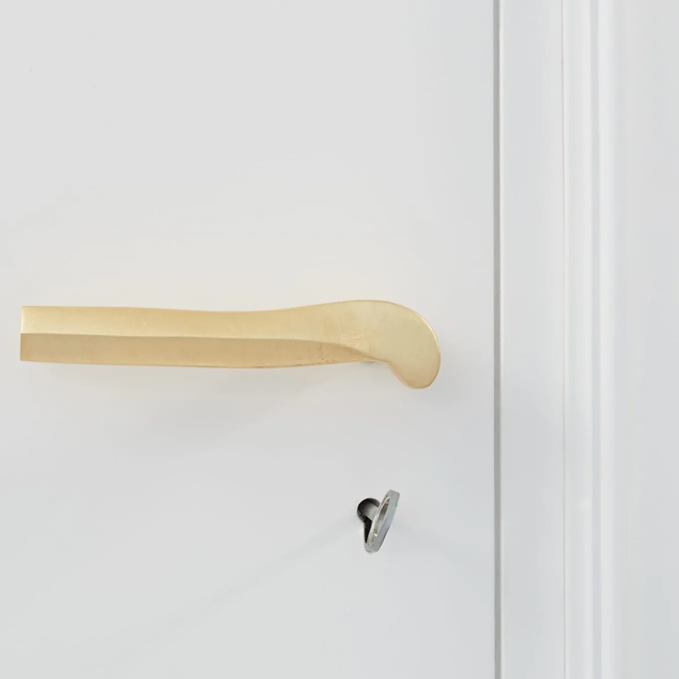 Sleek and sophisticated, this door handle will add a lavish, captivating accent to a contemporary door. Handmade of aluminum and finished with precious gold leaf, it belongs to the Prisma series exclusively designed by Nicole Valenti and defined by an intriguing end composed of concentric hexagons.