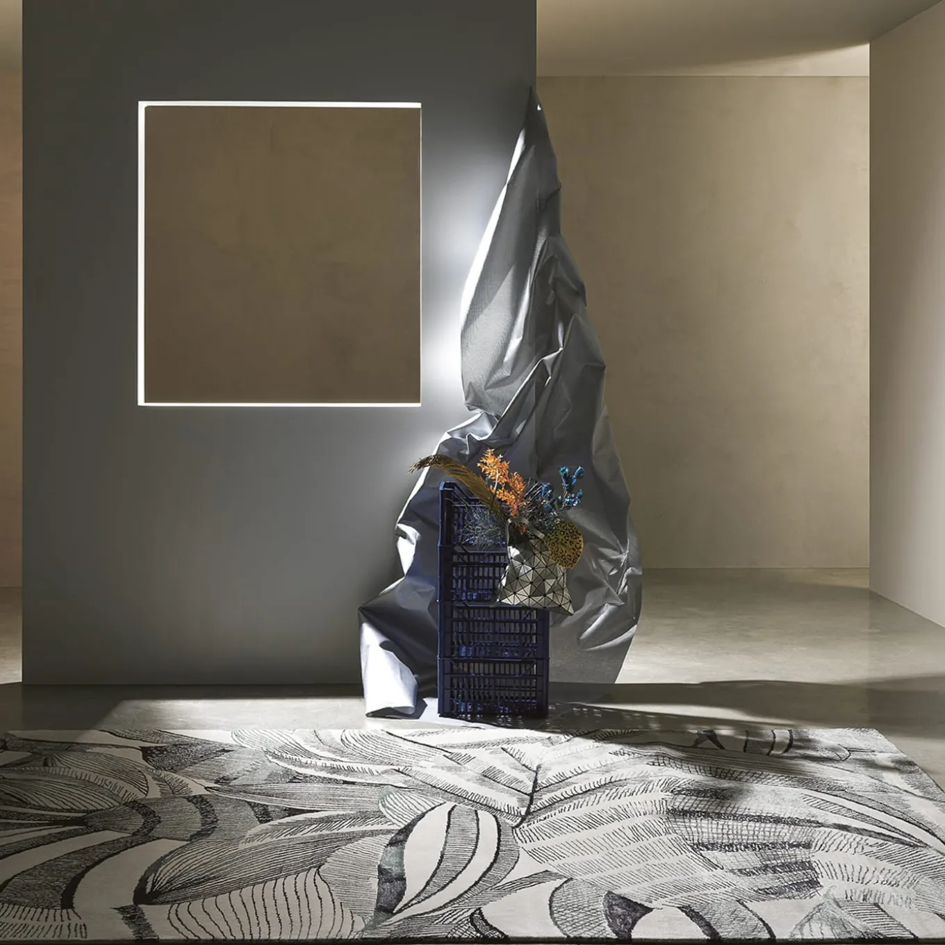 The Profumo Arbustum rug by Marta Giardini showcases botanical-inspired motifs that evoke a bird’s eye view of swaying grass meadows. Crafted using an ancient weaving technique, it blends bamboo silk and wool to create intricate patterns of leaves, flowers, and blooms forming dynamic, wave-like shapes. This harmonious interplay of filled and empty spaces embodies contemporary style with sophisticated natural elegance. Made in india.