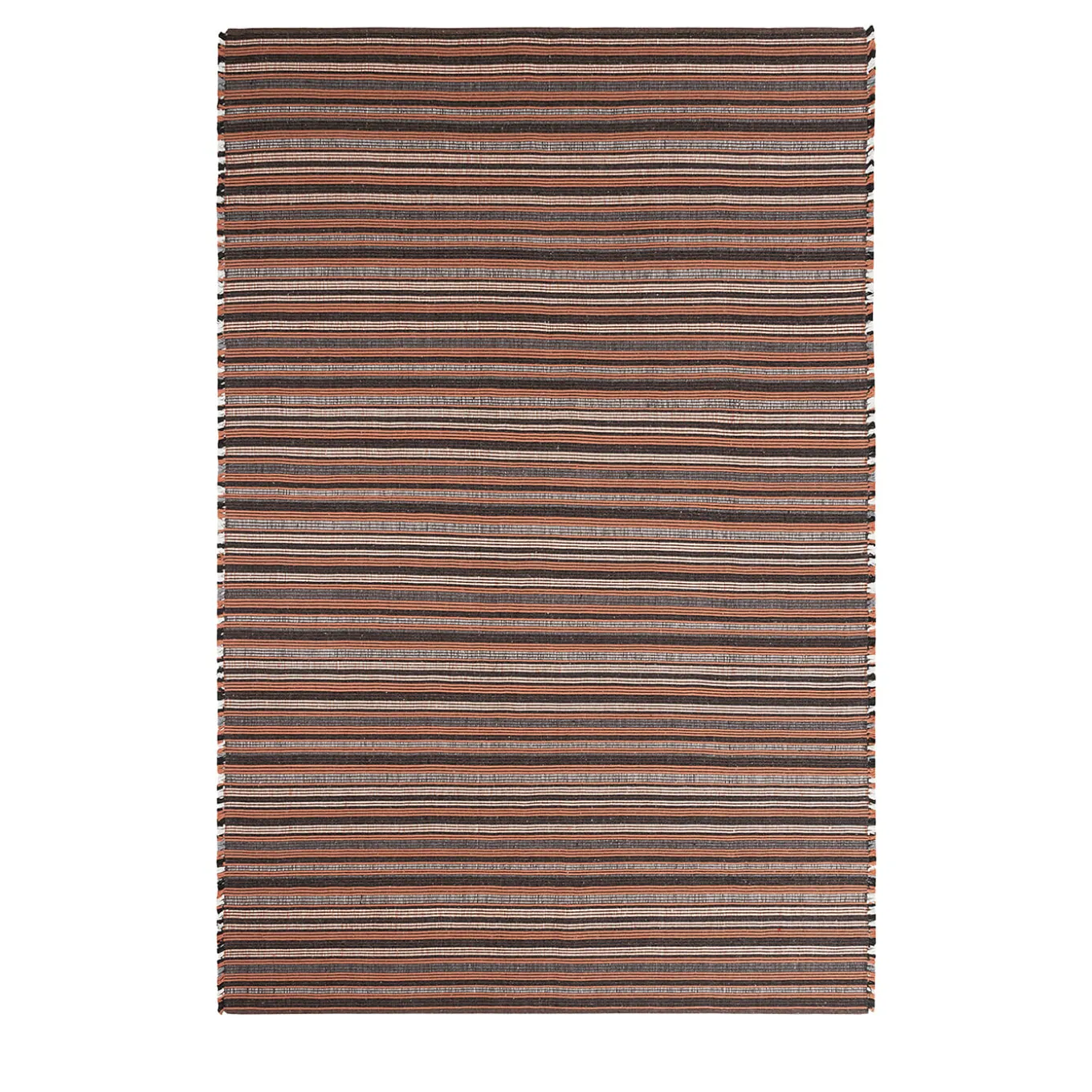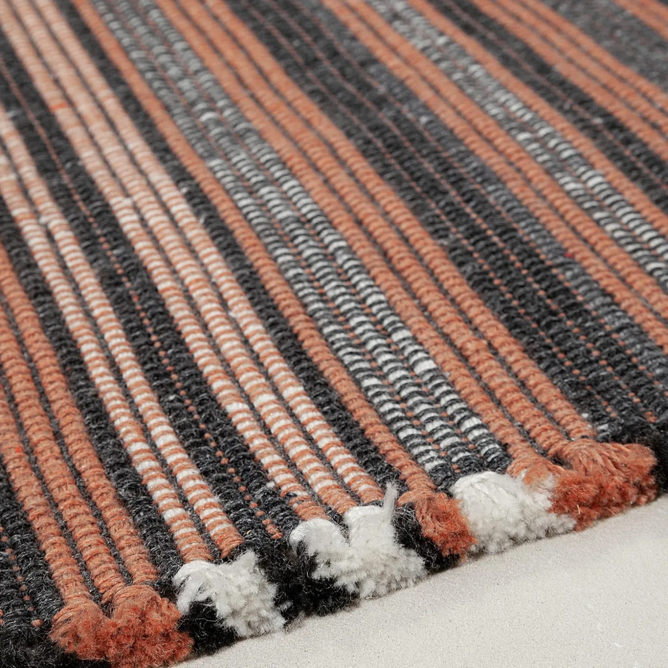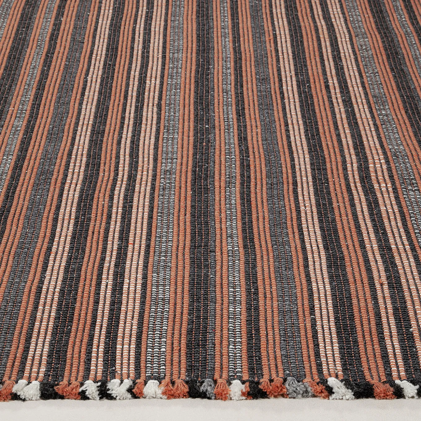 A bold reinterpretation of traditional weaving, Prune stands out with its dynamic striped pattern in charcoal and coral. The rhythmic play of colors and textures creates a sense of movement, making it a statement piece in any space. Handwoven from recycled PET fibers, it blends sustainability with artistic craftsmanship, evoking the rustic charm of vintage textiles while remaining firmly contemporary. Suitable for both outdoor and indoor use.