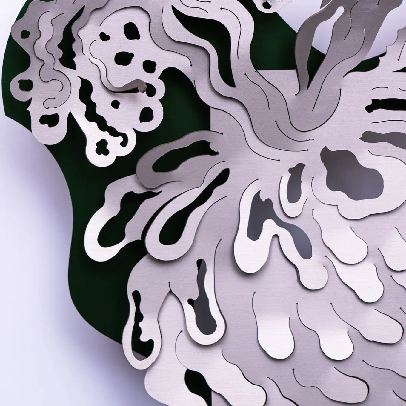 A tribute to Psyche, the ethereal and curious beauty of the mythological world, this stupendous wallpaper belongs to an exclusive series designed by Matteo Cibic. Handmade of metal, it features silver and green finishes, enhanced with a sophisticated shadowing game. Please consult the Concierge for further information.