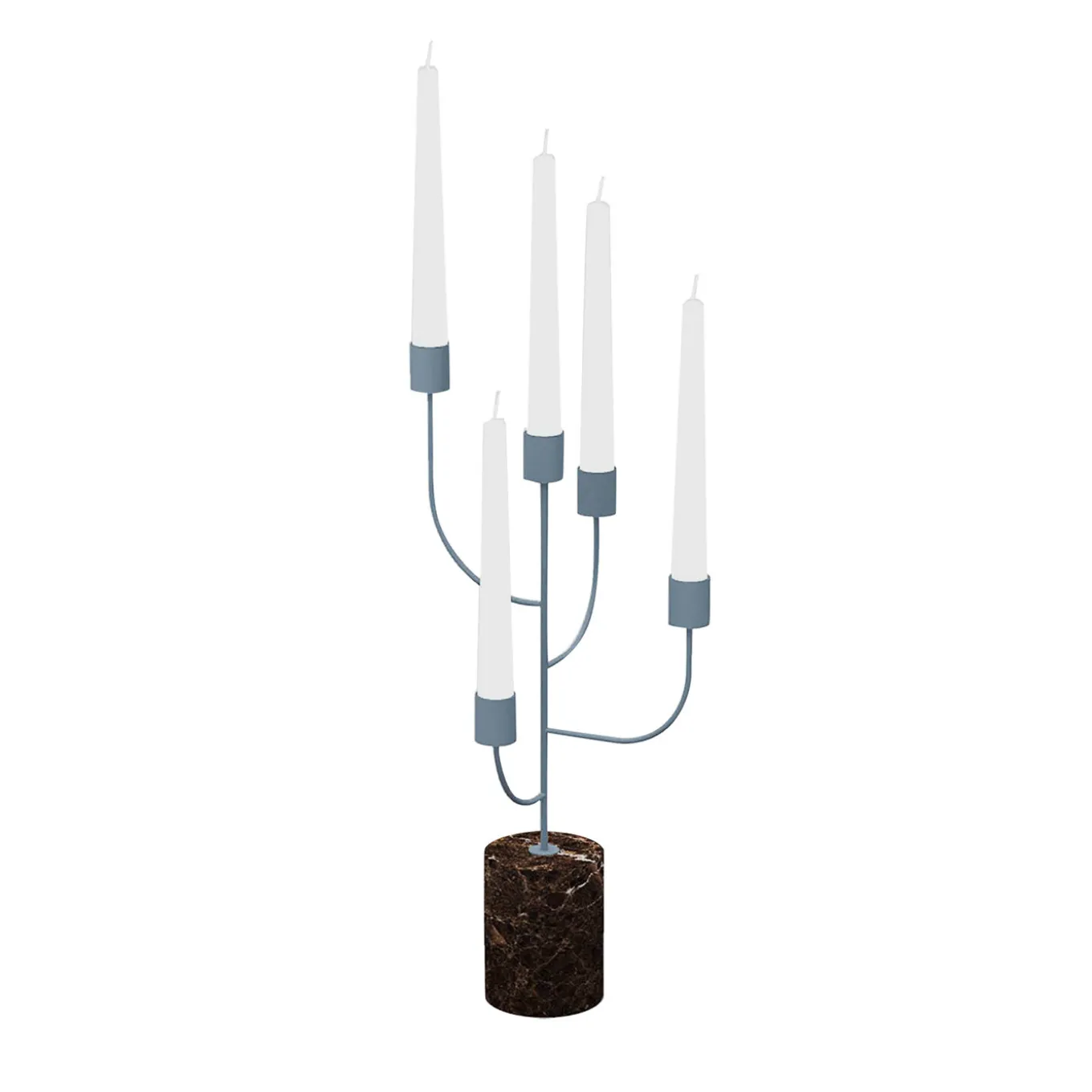 Stunningly elegant in its eclectic silhouette, this gorgeous candle holder features a delicate yet dynamic profile inspired by the upward movement of tree branches. A smooth, cylindrical base in Emperador Dark marble sustains the baby blue-lacquered metal frame comprised of five candlesticks, rising upwards from a central stem and stopping at different heights. This iconic piece is available in other precious marbles and lacquers, please ask for options and pricing details.