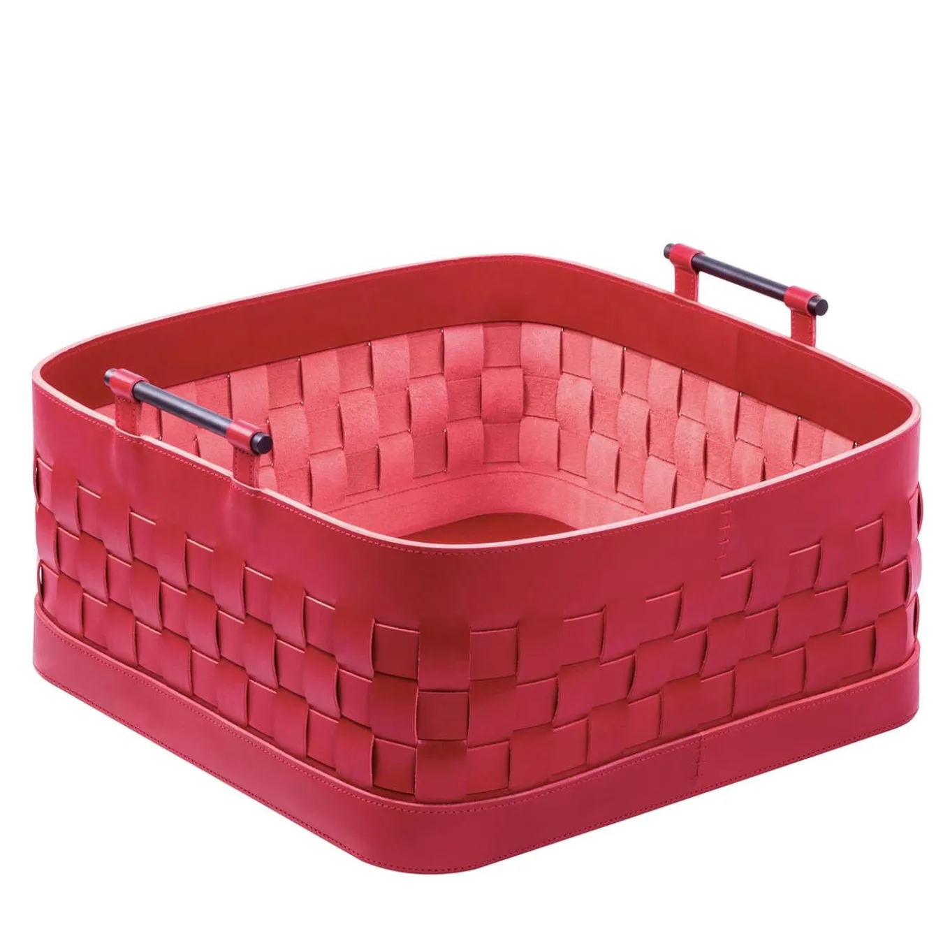 Elegant and lively, the design of this basket will be eye-catching in a modern decor, adding a splash of vibrant color to any room in the house. Either used to hold everyday objects of showcase collectibles, this piece can be displayed alone or with others in the same Ravenna Collection in different shapes and colors. This basket is composed of braided, water-resistant strips of leather that form the square silhouette of this piece have a vivid red hue, legally contrasting with the brushed bronze of the handles.