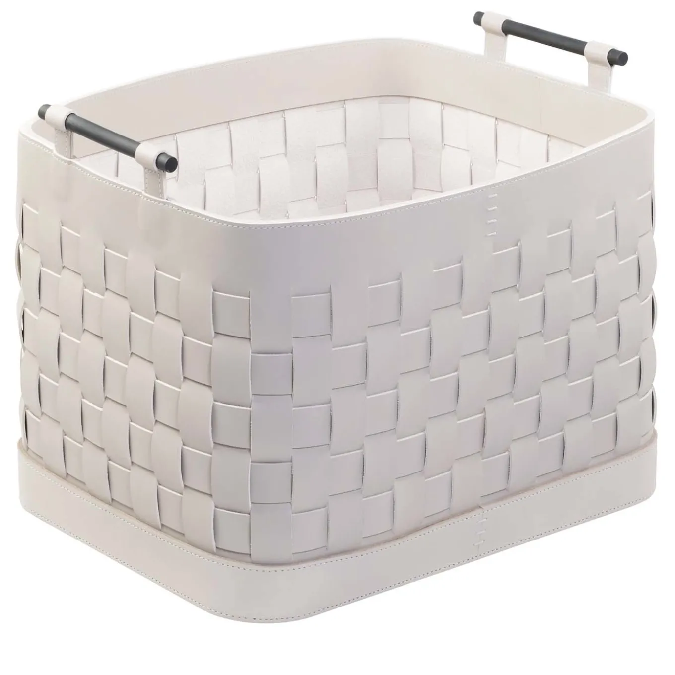 Modern elegance and traditional craftsmanship meet in this versatile and striking basket that will suit any contemporary interior. Its versatile shape, tall edges, and two cylindrical brushed bronze handles make it a precious storage space and display tray for a variety of objects around the house. The striking texture of this piece is obtained by waving strips of water-resistant saddle leather that was dyed white using vegetable pigments. This sophisticated and contemporary object of functional decor is part of the Ravenna Collection and can be combined with others in the same series.