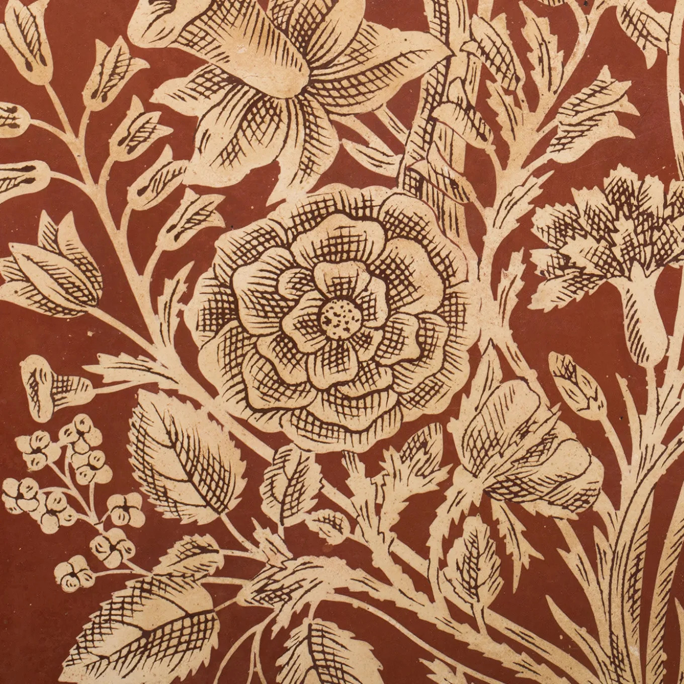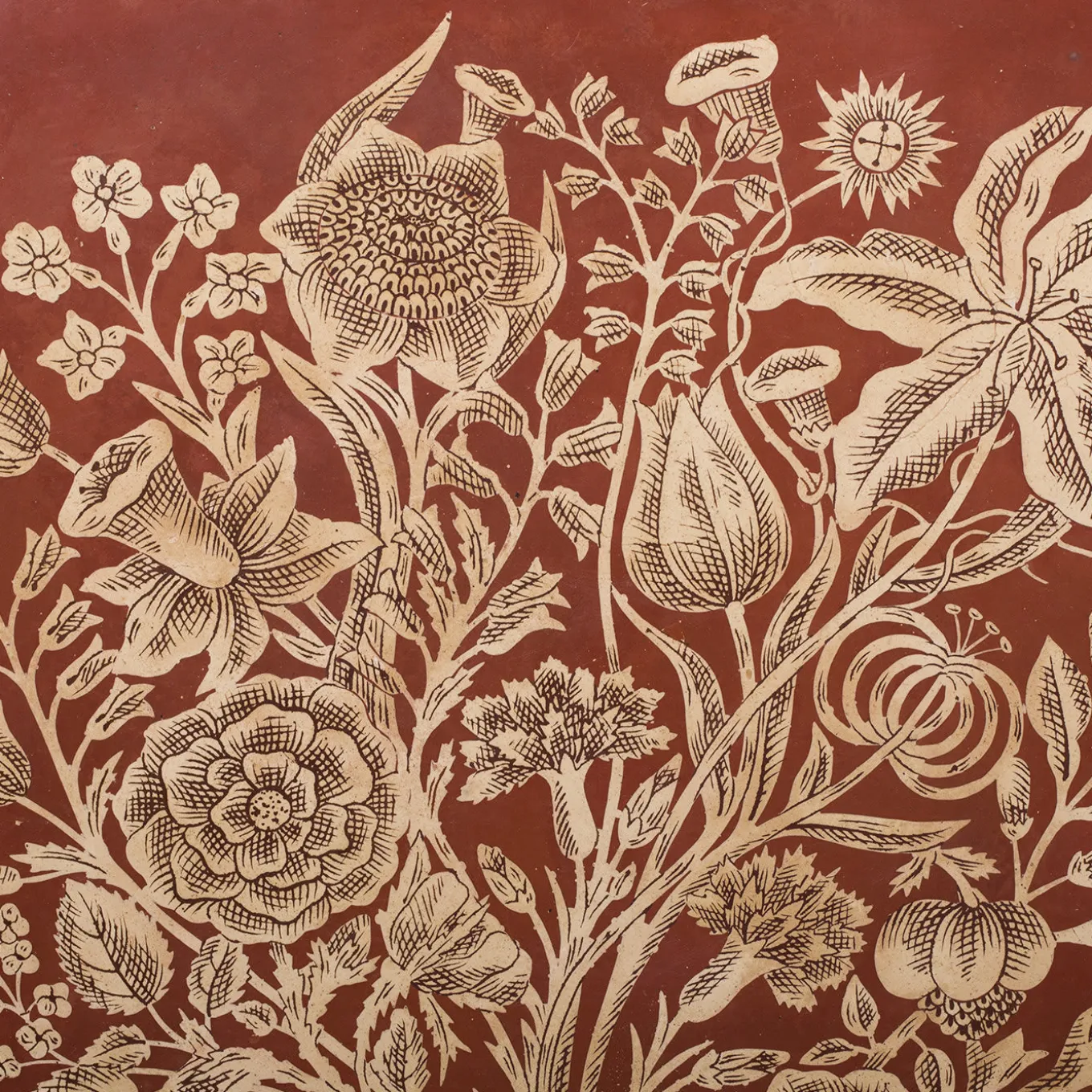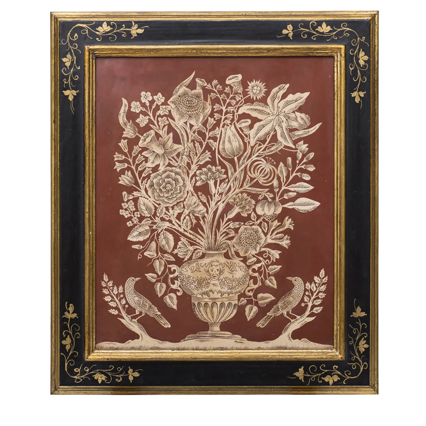 Tableau recherché entirely handmade in red and ivory marble inlay, achieved employing the traditional scagliola technique. The design was inspired by an 18th century original by the same house, and has been coupled with a classic black wooden frame with gold detail.