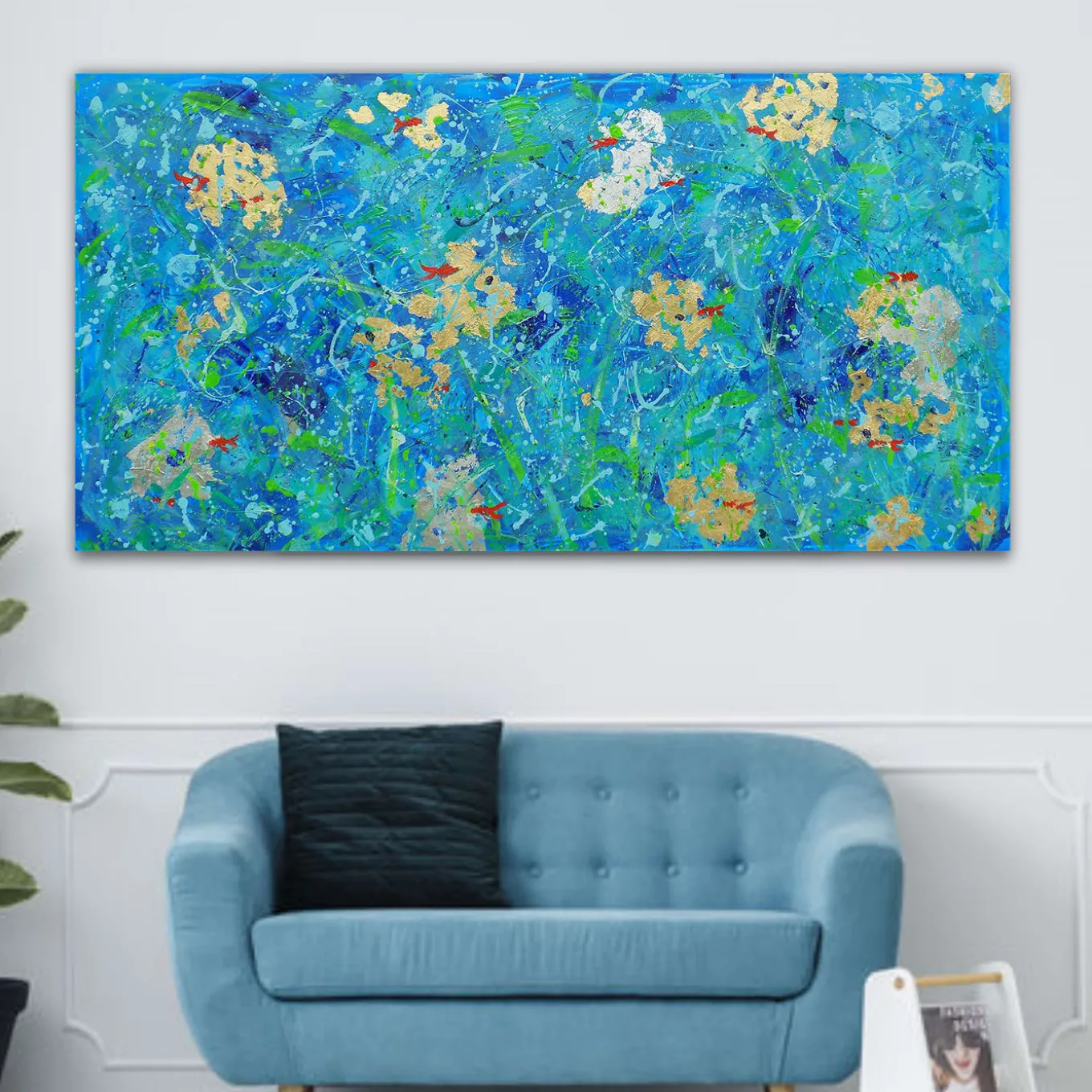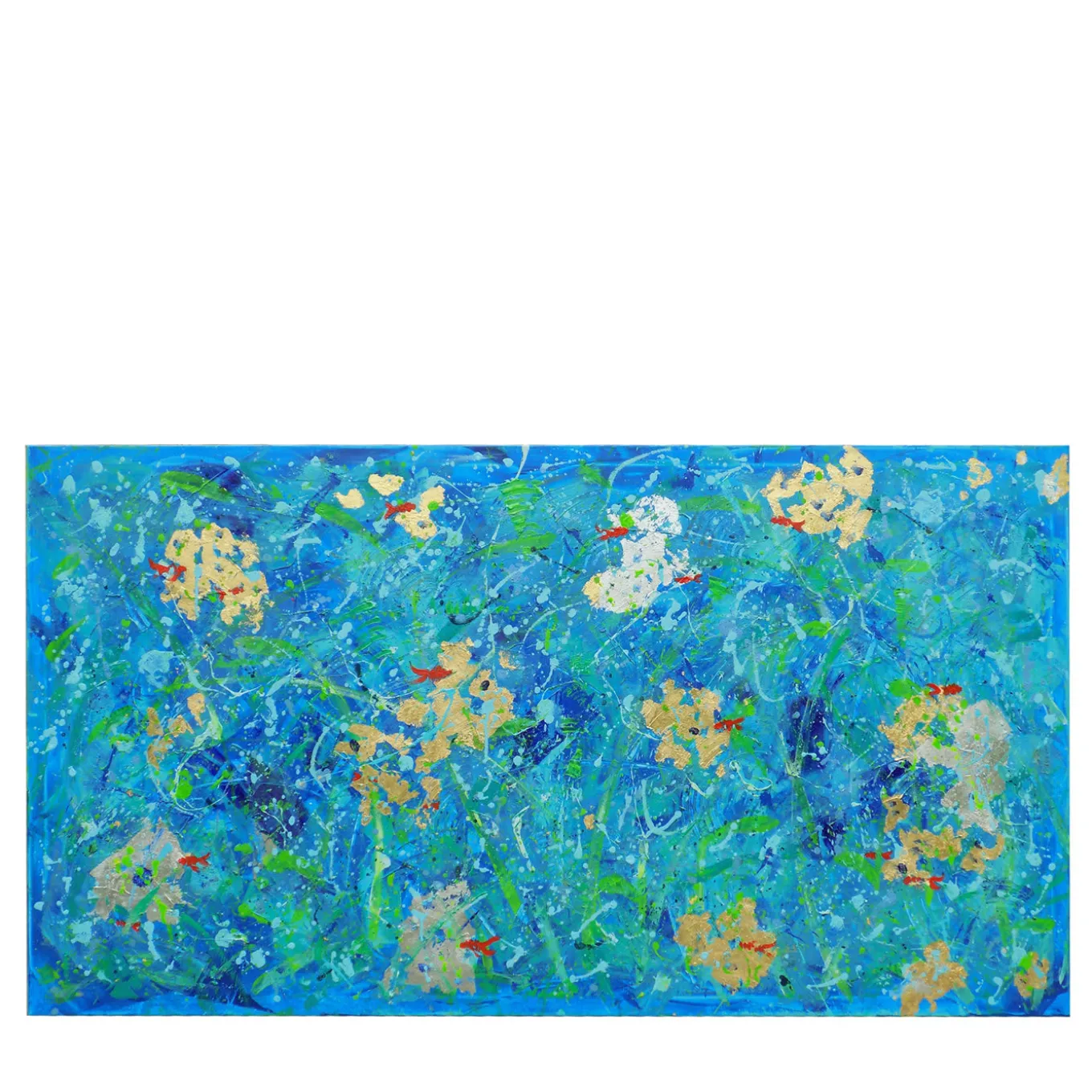 This acrylic painting will be a unique and captivating statement in a contemporary interior thanks to its vivid hues. An abstract interpretation of a river where red fish live, the piece is enriched with gold and silver leaves evoking the sun’s dazzling reflections on the water surface. A singular luminous and symbolic work of art, it is customizable in size upon request, with a variation of price and possibly of features. It is available with or without a frame.