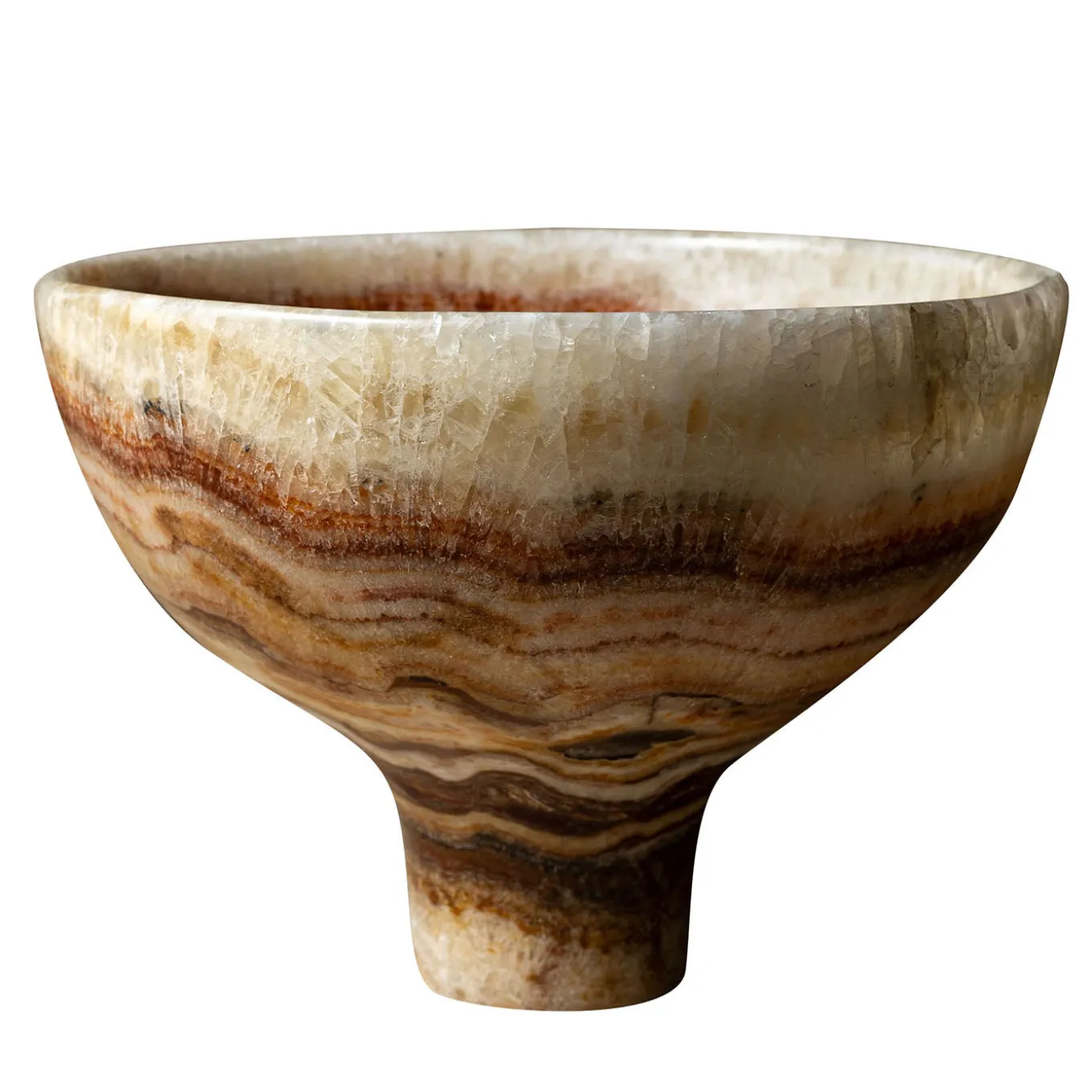 A decorative bowl centerpiece from the collection Sunrise, featuring a unique red onyx design with lighter gradient shades. Its distinctive color variations create a striking visual effect, making it an elegant and versatile object suited for various interior settings. Its refined size and sculptural form allow it to stand out as an elegant accent piece in any room.