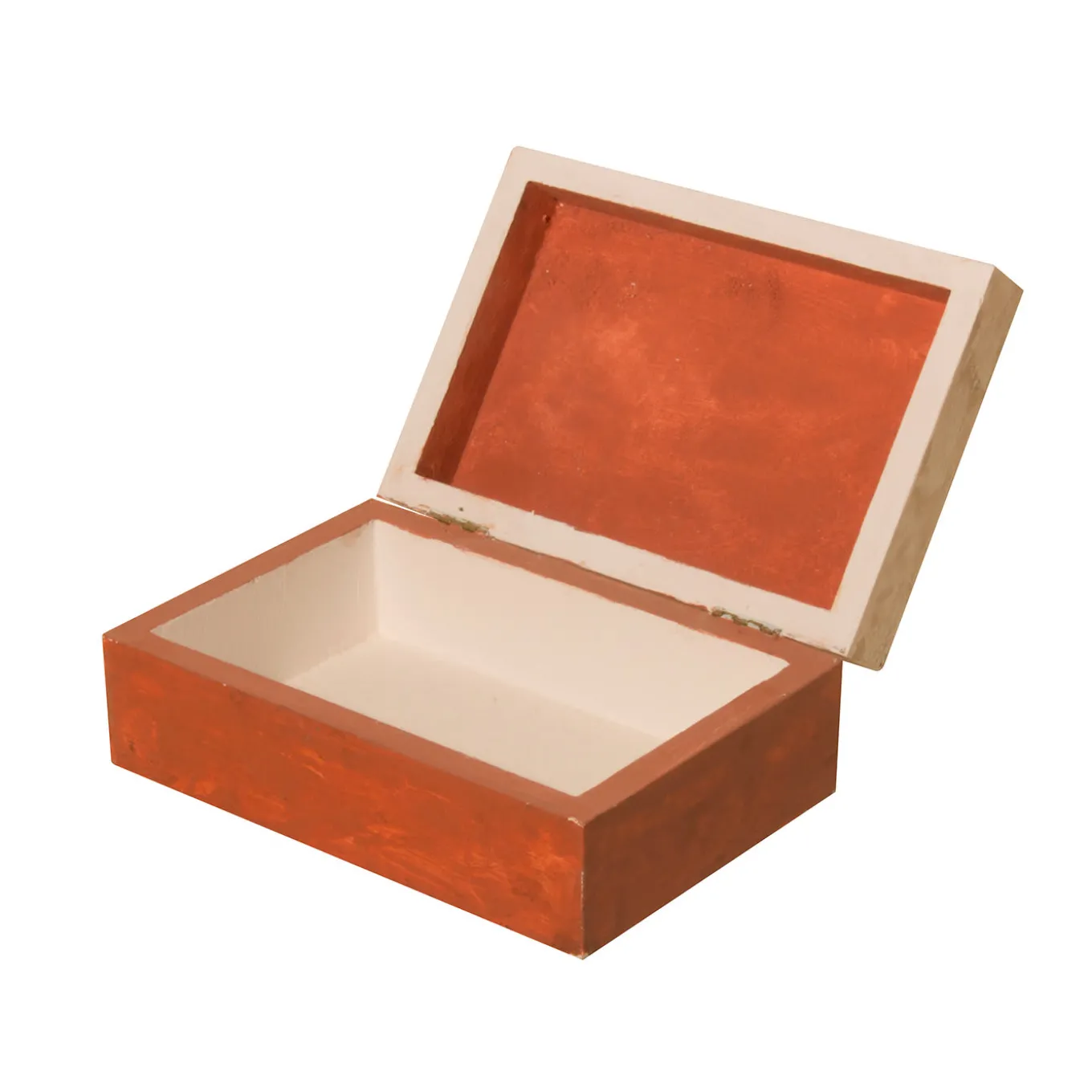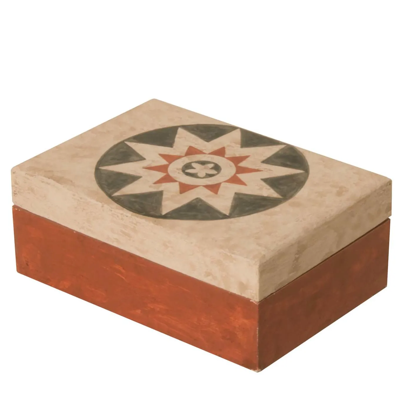 Function meets art in this exceptional handmade box crafted of repurposed wood using traditional Florentine techniques. The rectangular silhouette is hand painted in vibrant red and white acrylic tempera, the marbled texture “encausto veneziano” style achieved by applying color with a sponge. The red bottom is topped with a white lid boasting a ten-pointed star motif with red accents and framed by a green circle. This box is perfect for storing, jewelry keepsakes, or stationary anywhere in the home. Painted with natural pigments and finished with a protective beeswax coating.