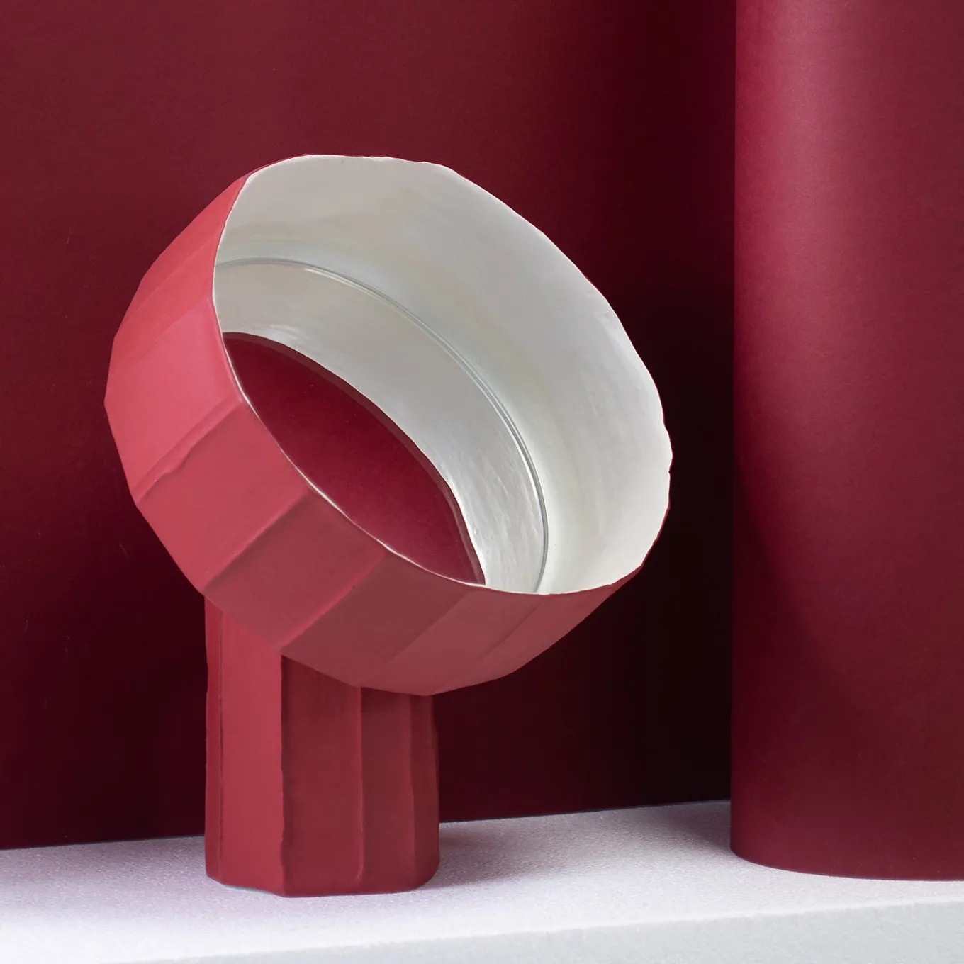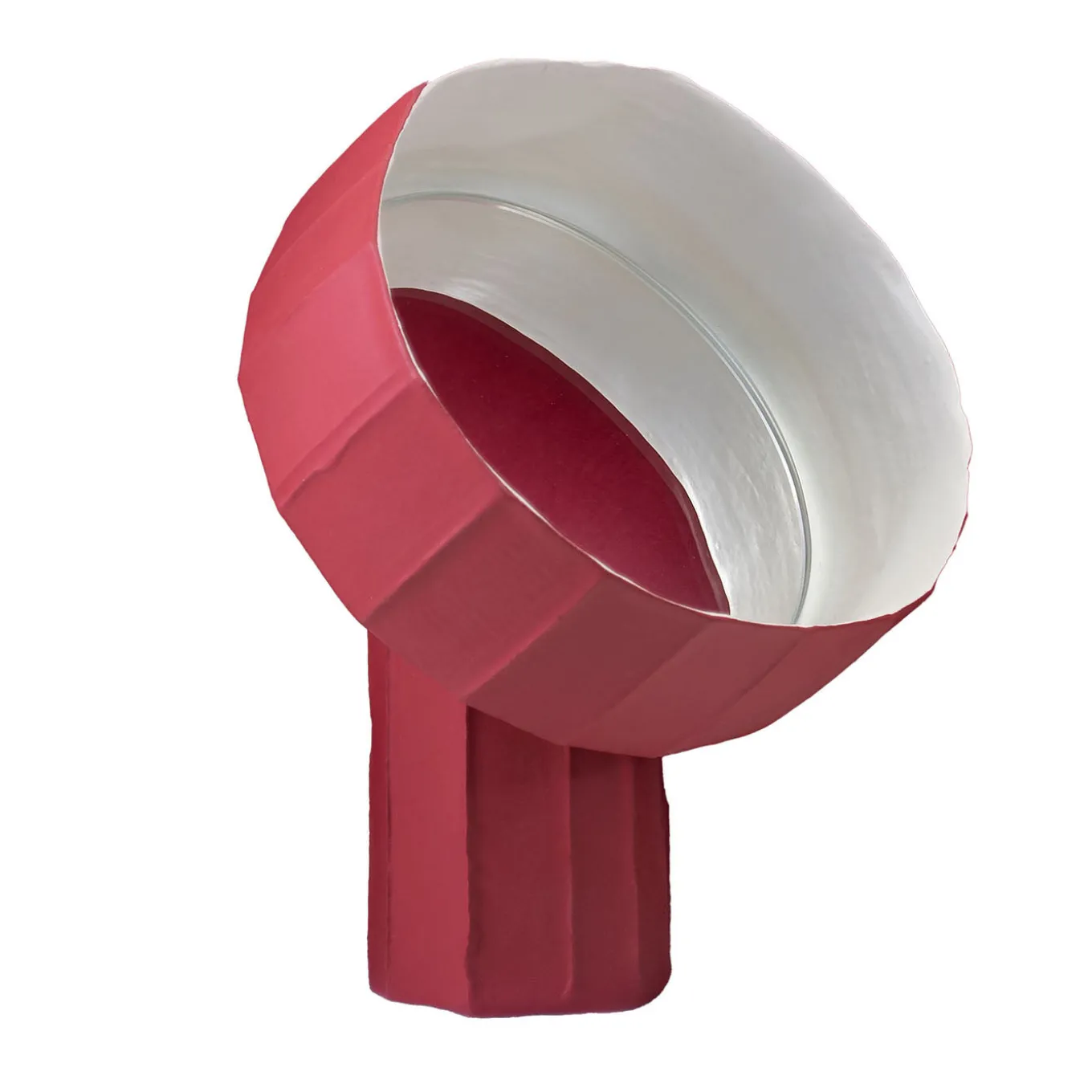 Tabletop mirror featuring a sculptural design inspired by the natural forms of sunflowers. Its irregular, faceted frame in a rich, velvety red hue creates a dynamic interplay between color and form, evoking movement and vibrant stillness. The mirror’s geometry is influenced by Colour Field Painting principles, bridging nature and art in a distinctive decorative object. Design by Paola Paronetto and Giovanni Botticelli.
