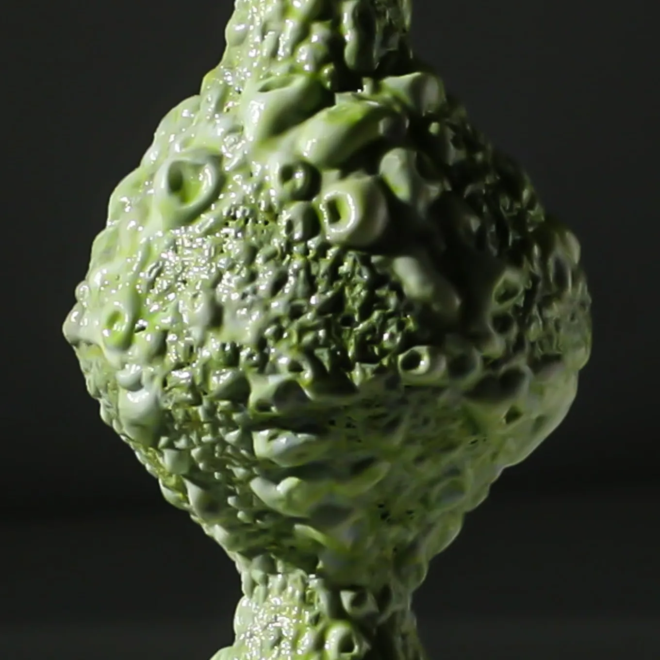 A sinuous silhouette immediately channels this green bud vase’s sensual character. Distinguished by a special volcanic texture of tiny bumps and craters obtained by following a special glazing technique, its silhouette culminates in an indented mouth recalling a crown’s profile. Handmade and unique, it can be displayed as is or with flowers.