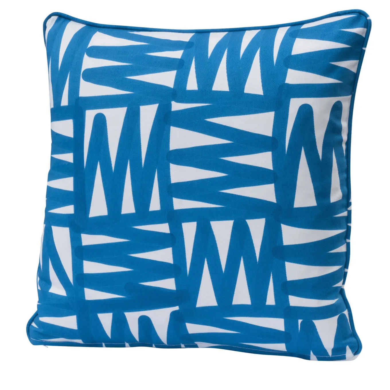 This striking cushion has a down insert with a cover in 100% cotton decorated with a pattern of blue nets arranged in squares over a white background.