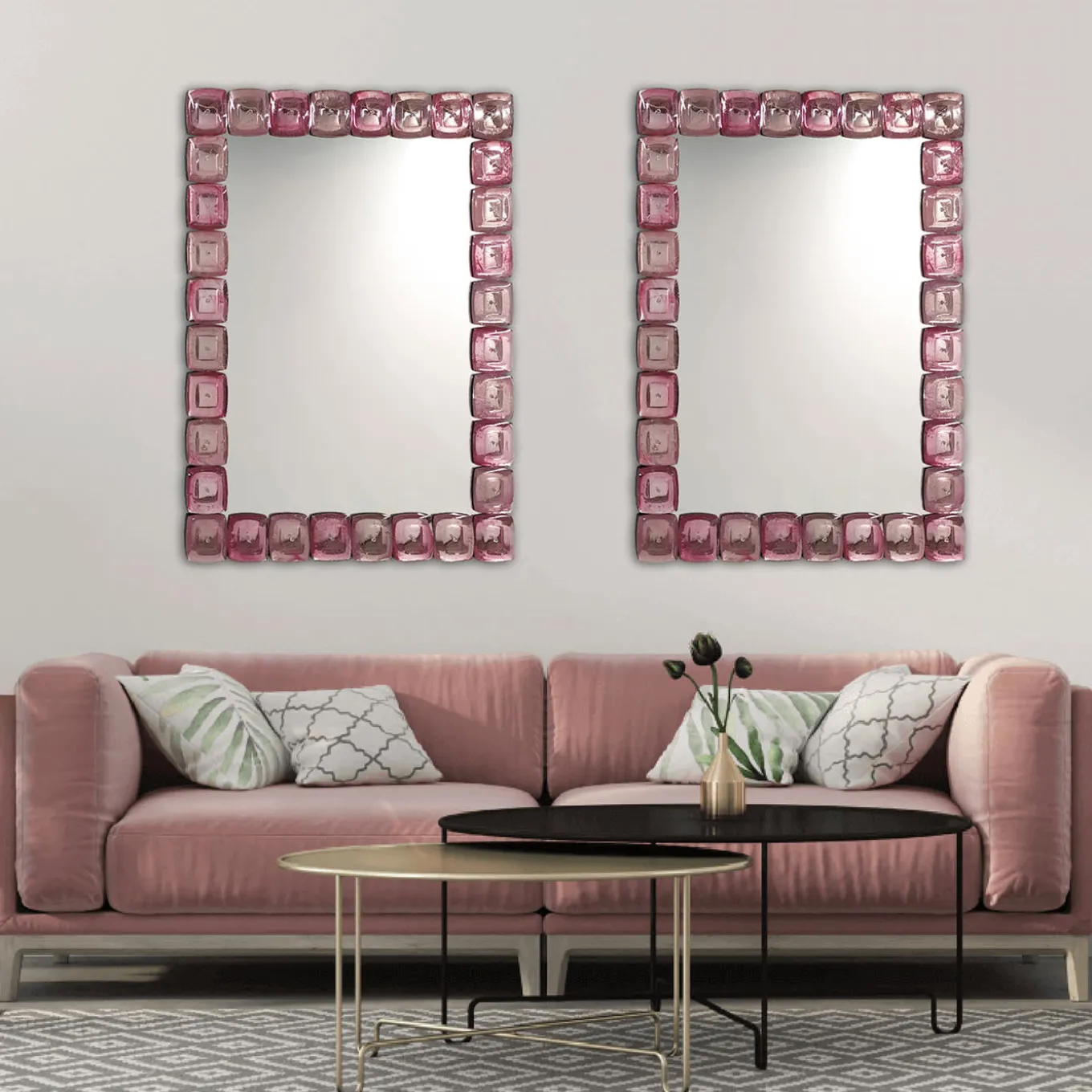 “Rettangolo Rubino” Murano glass mirror in Contemporary style from the “Dischi” series. The frame is composed of 32 solid glass pieces, beveled, with air bubbles intentionally embedded inside the glass squares to create numerous small, imperfect bubbles, all handcrafted. Each block of this frame is then hand-silvered with pure silver to provide a unique brilliance. This piece is entirely artisan-made on the island of Murano, another example of a contemporary mirror created by Fratelli Tosi.
