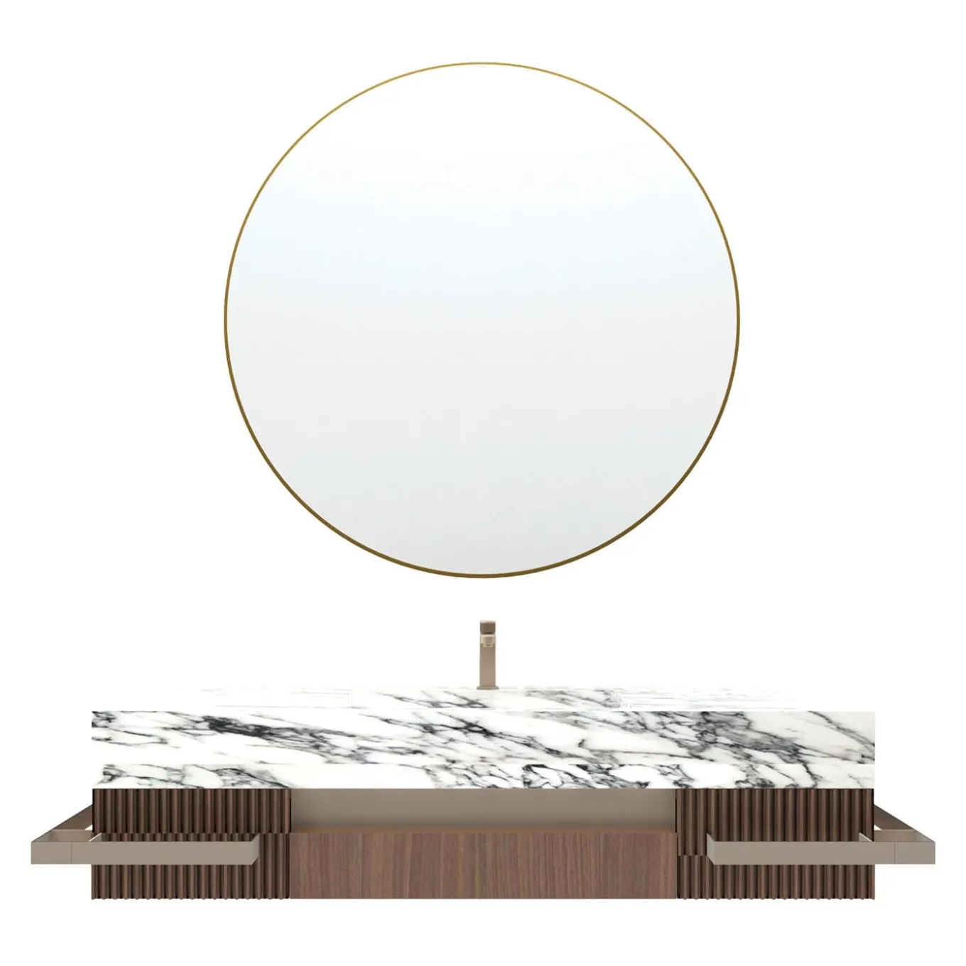 The Revival Arabescato Vagli bathroom vanity features a solid wood frame with a distinctive 3D architectural design that adds depth and sophistication. The top is made of high-quality marble with an integrated basin for a seamless appearance. Custom handles double as towel holders, blending style with practicality. Complemented by a large Ø120 cm round wall mirror with neutral LED lighting, touch controls, a clock, weather station, and an anti-fog heating panel, this vanity balances elegance and advanced functionality. Faucets are not included.