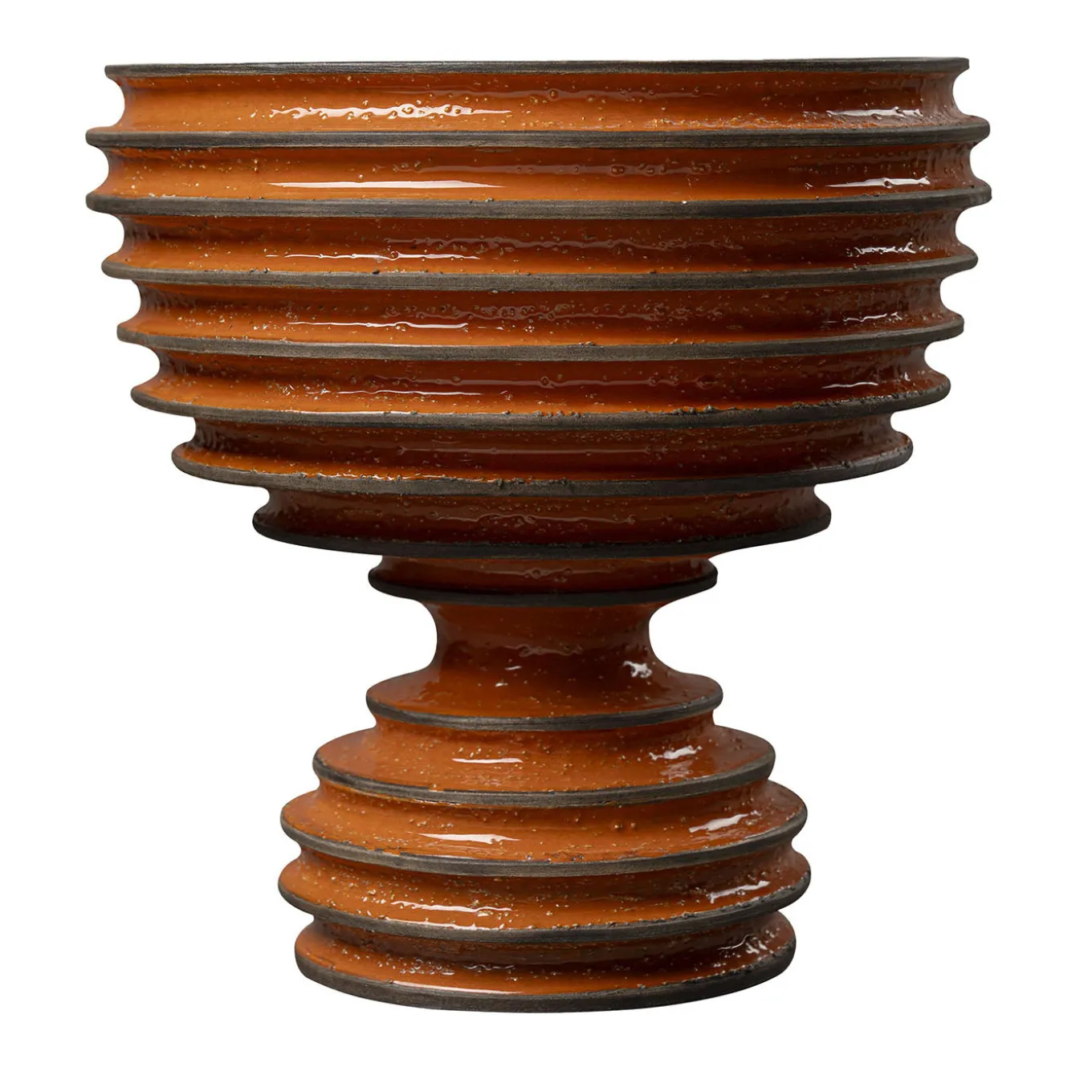 A traditional design dressed in a stylish contemporary suite, this ceramic goblet is part of the exclusive Revolver Collection, showcased at Milan Design Week in 2019. The hourglass-shaped, orange-hued silhouette features a spacious bowl resting on a convex base, both distinguished by a deeply ribbed texture accented by brown edges.