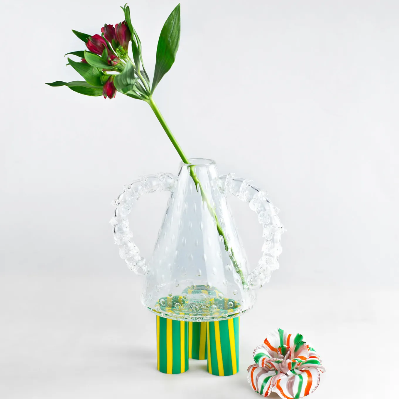A sculpture inspired by the first Venetian glass chandeliers crafted in the eighteen century. With a body featuring baloton air trapping, the arms are made to imitate the arms of chandeliers and the legs are made in bold yellow and green. The piece is topped with a Torcelo flower in green, orange and mauve, expertly crafted by a Venetian master.