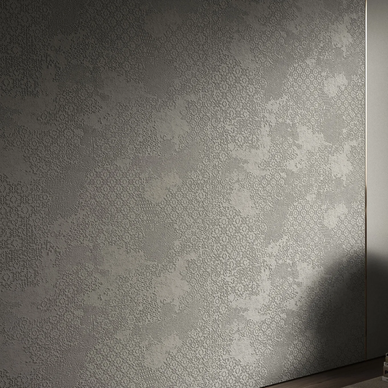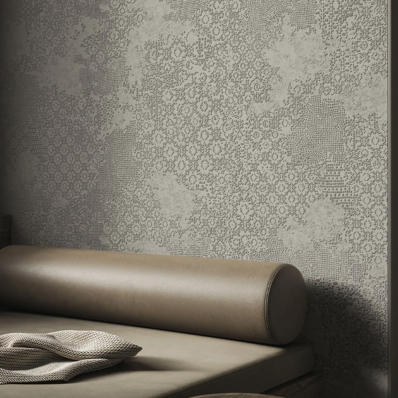 The Ricami wallpaper from the Tramae collection features a delicate motif inspired by the intricate textures of traditional hand weaving and antique lace. Its embossed details and fine engravings create a subtle tactile surface that evokes nature and abstraction, adding a layer of depth and visual interest to any wall. This wallpaper transforms interior spaces with a refined interplay of texture and pattern, offering a contemporary interpretation of artisanal fabric craftsmanship.