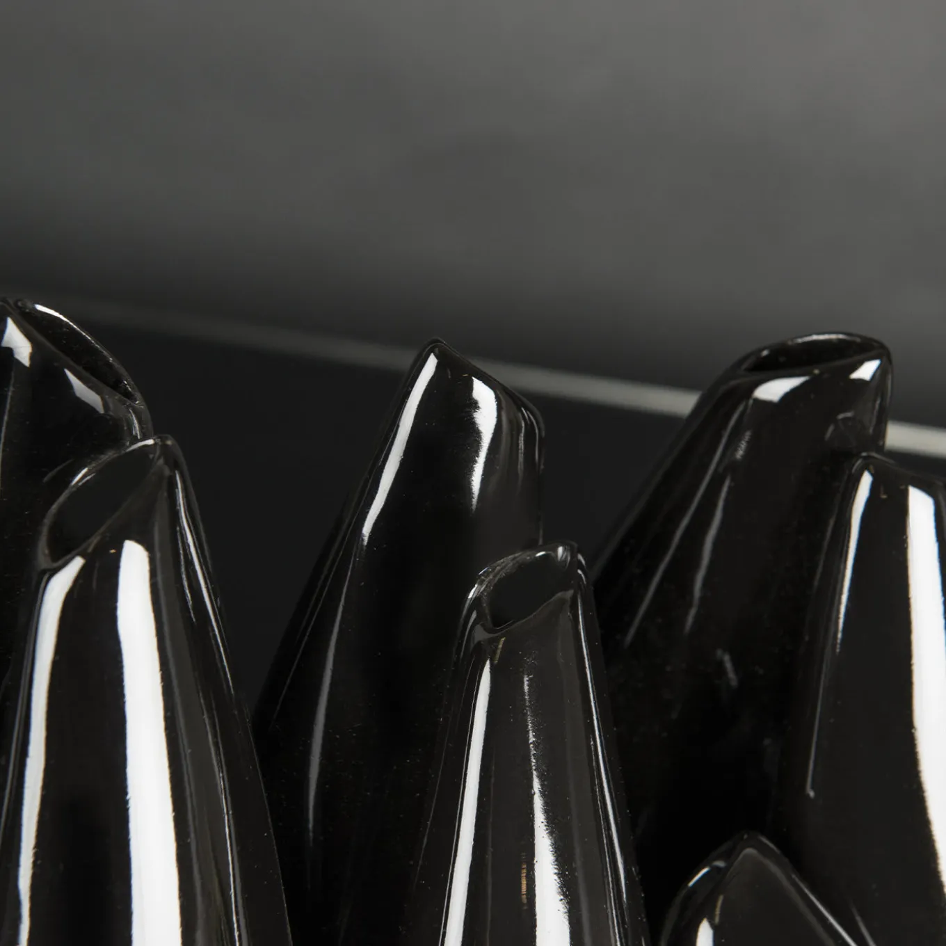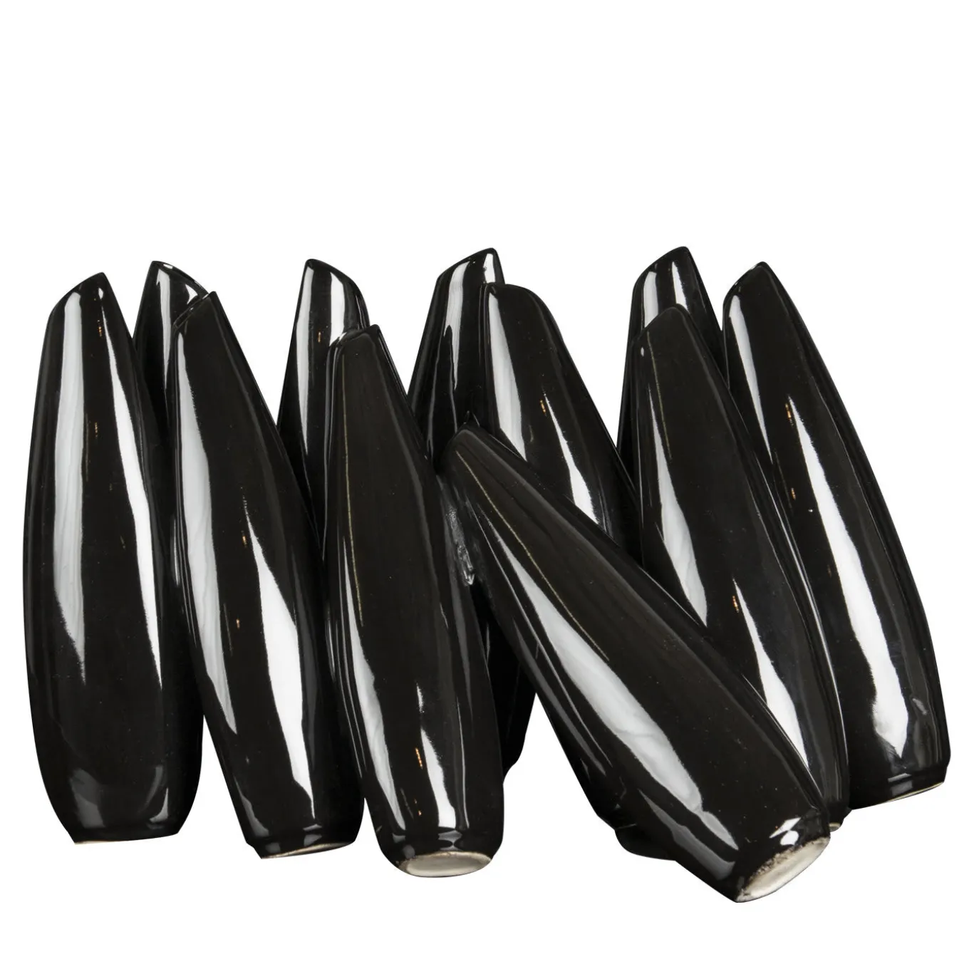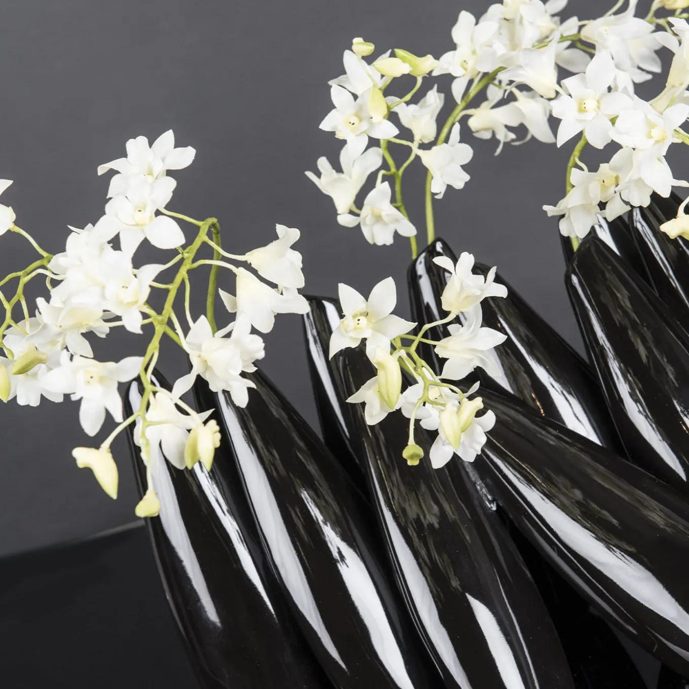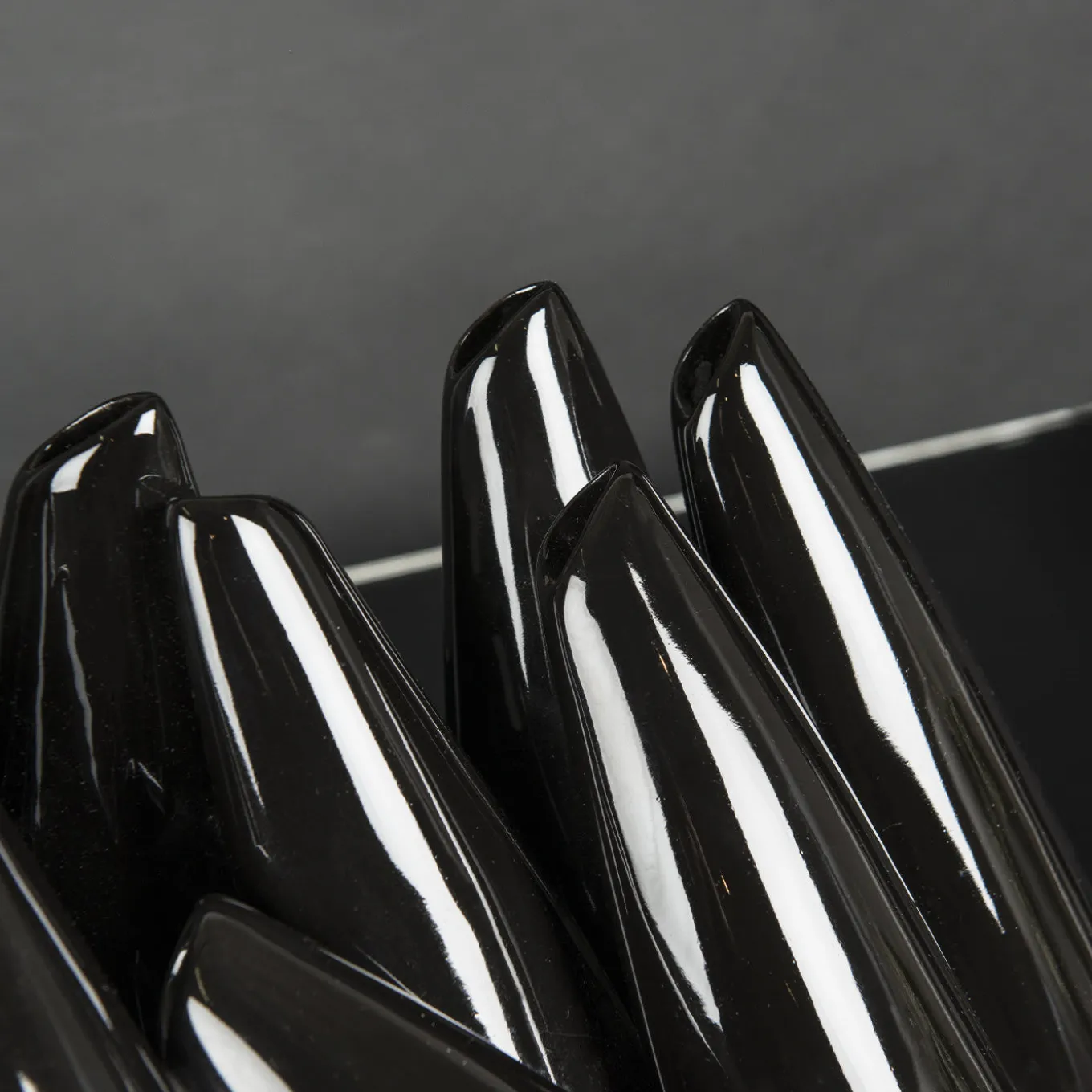 A sculptural composition that functions as a bud vase for a series of single flowers, this splendid piece is the result of dedicated and meticulous craftsmanship. Crafted of black-lacquered ceramic, it is composed of various elements in a straight or oblique position, reminiscent of bowling pins.