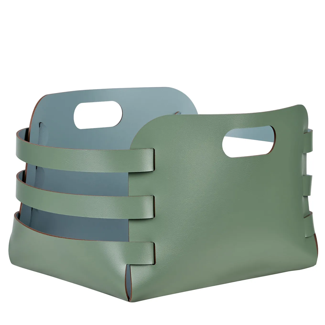 Crafted from luxurious leather, this basket offers convenient storage for magazines, plaids, and slippers. Its elegant design seamlessly blends practicality with sophistication. The eucalyptus and sky blue color scheme enhances its aesthetic appeal, making it a stylish addition to any room. Designed by Ekaterina Borovkova.