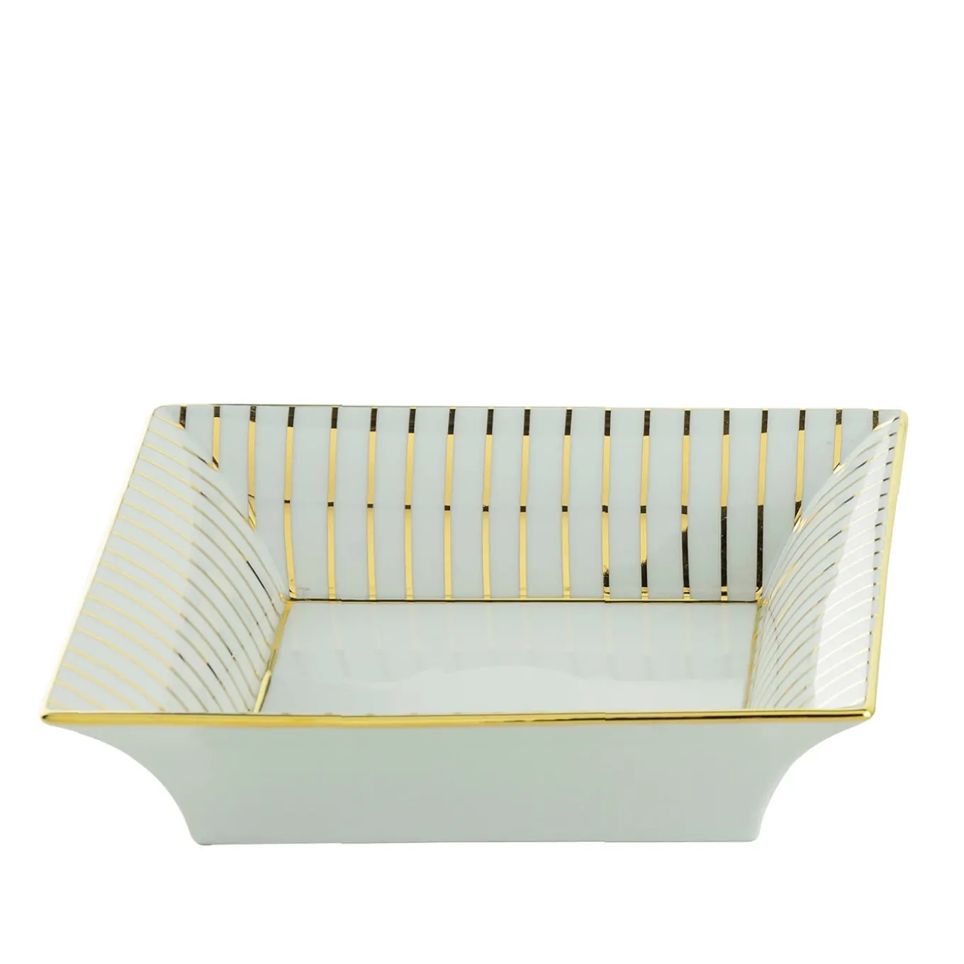 Elegant and refined, this empty pocket tray will be an exquisite addition to a console in a modern and sophisticated entryway. Showcasing mesmerizing stripes of 24K gold, the piece is masterfully handcrafted of fine white porcelain, and boasts a square shape with tall rims.