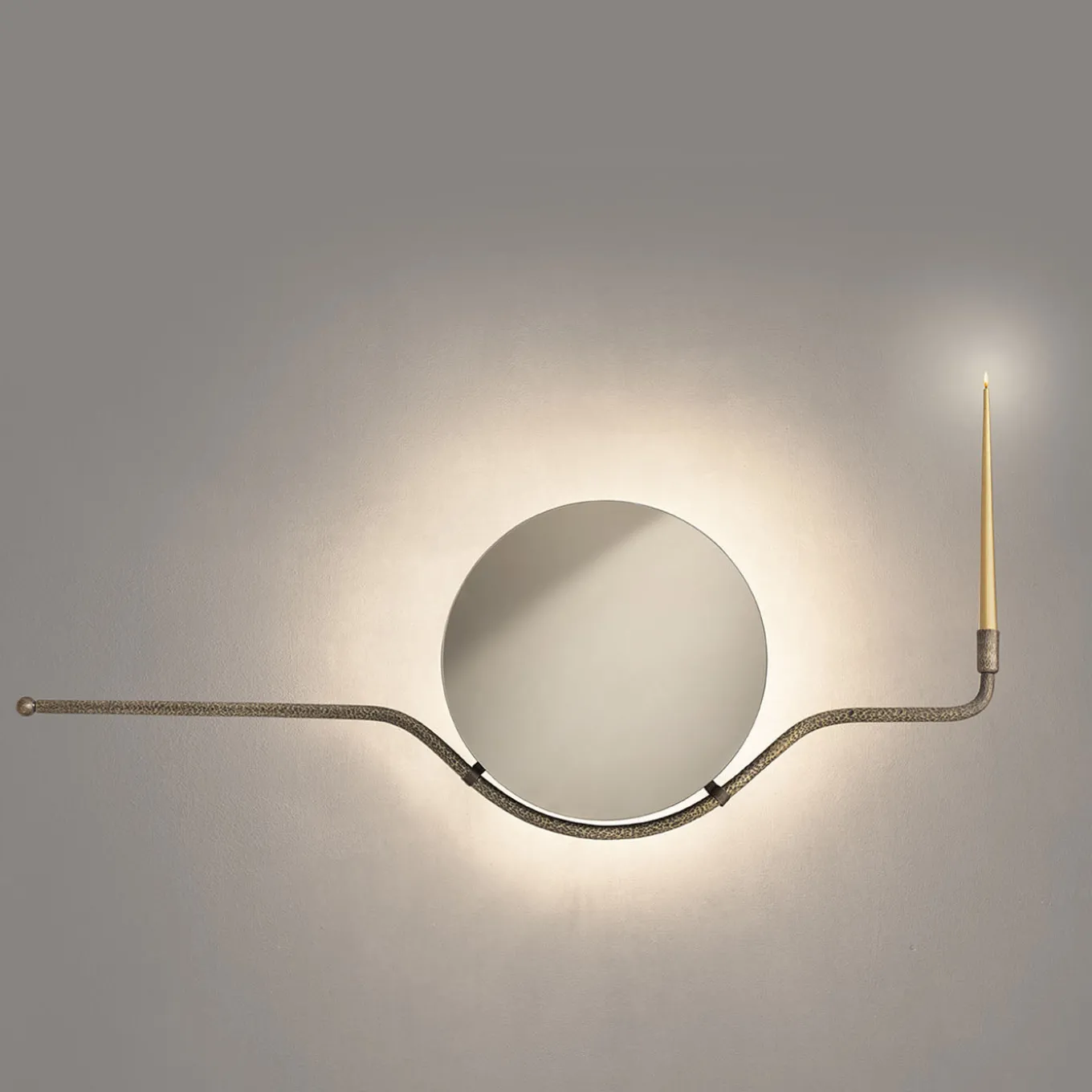 Rising Sun O, a collaboration with Aina Kari and Giovanni Botticelli, features stunning wall mirror with hand-worked brass candleholder cords. Inspired by Venetian heritage, these illuminated mirror seamlessly blend functionality and artistry. The intricate brasswork, featuring a burnished finish, adds a touch of contemporary sophistication. It is the perfect balance of tradition and modern design. A candle is included in the price.