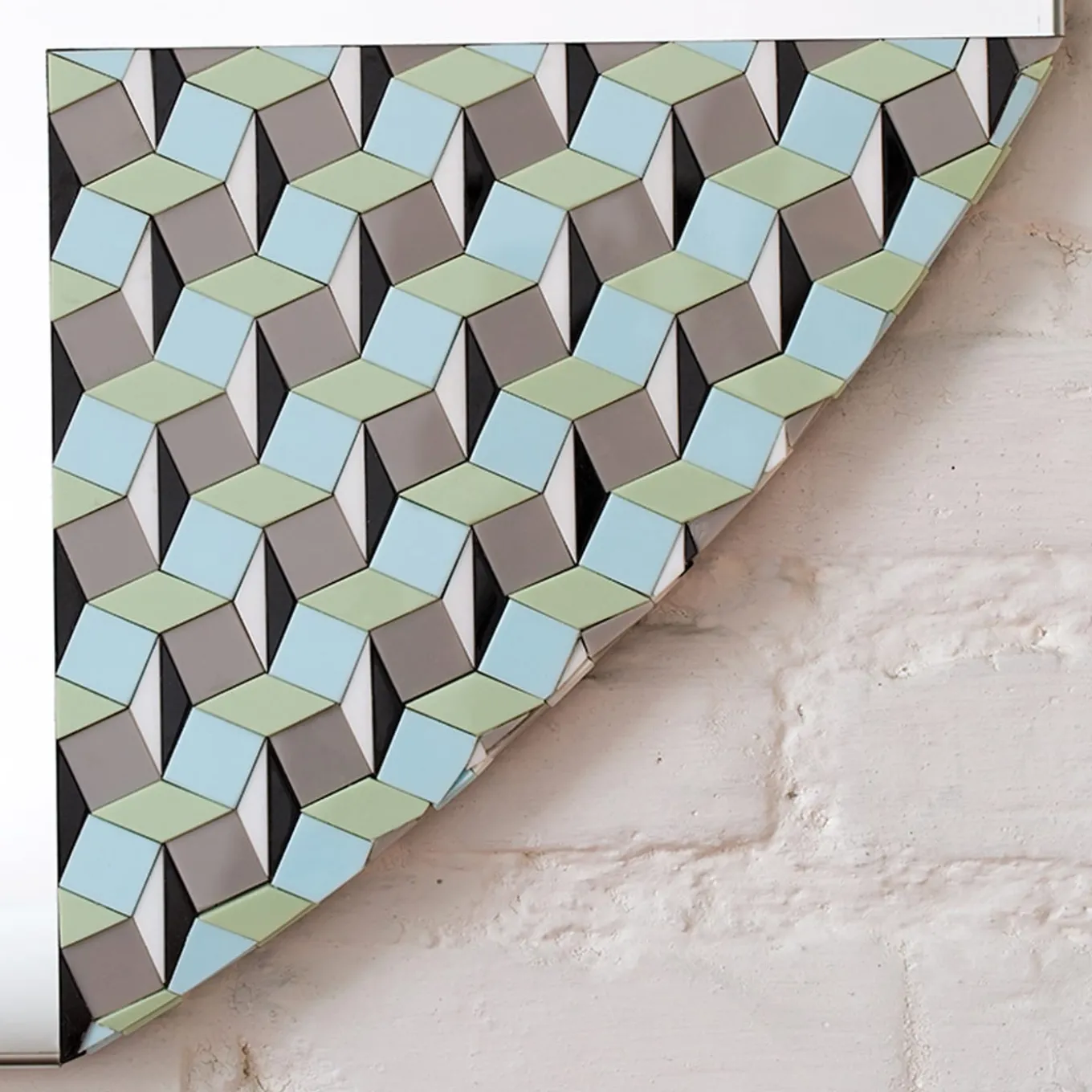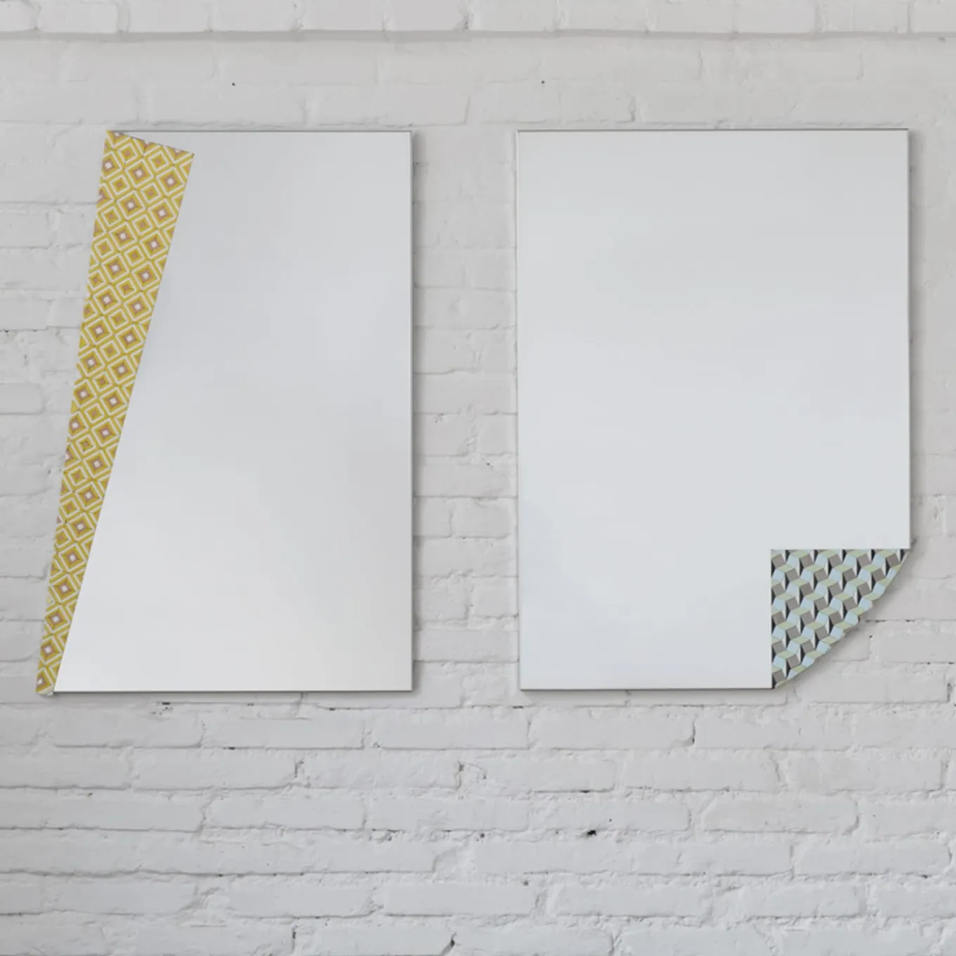 The Risvolti mirrors mix unconventionally a high-tech material such as Supermirror steel and opaline glass gone out of production since the ‘50. The steel modernity contrasts the vintage taste of the colored mosaic tassels, skillfully placed to design two different patterns.