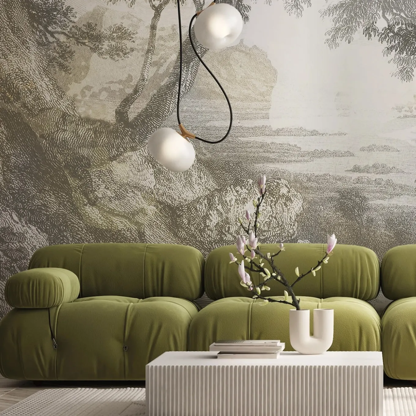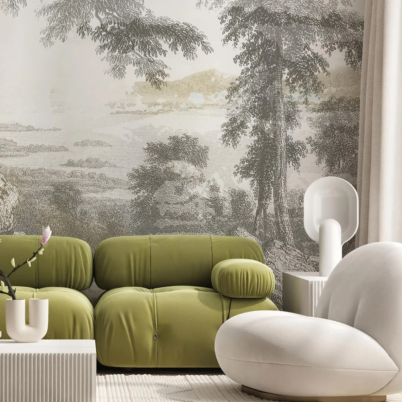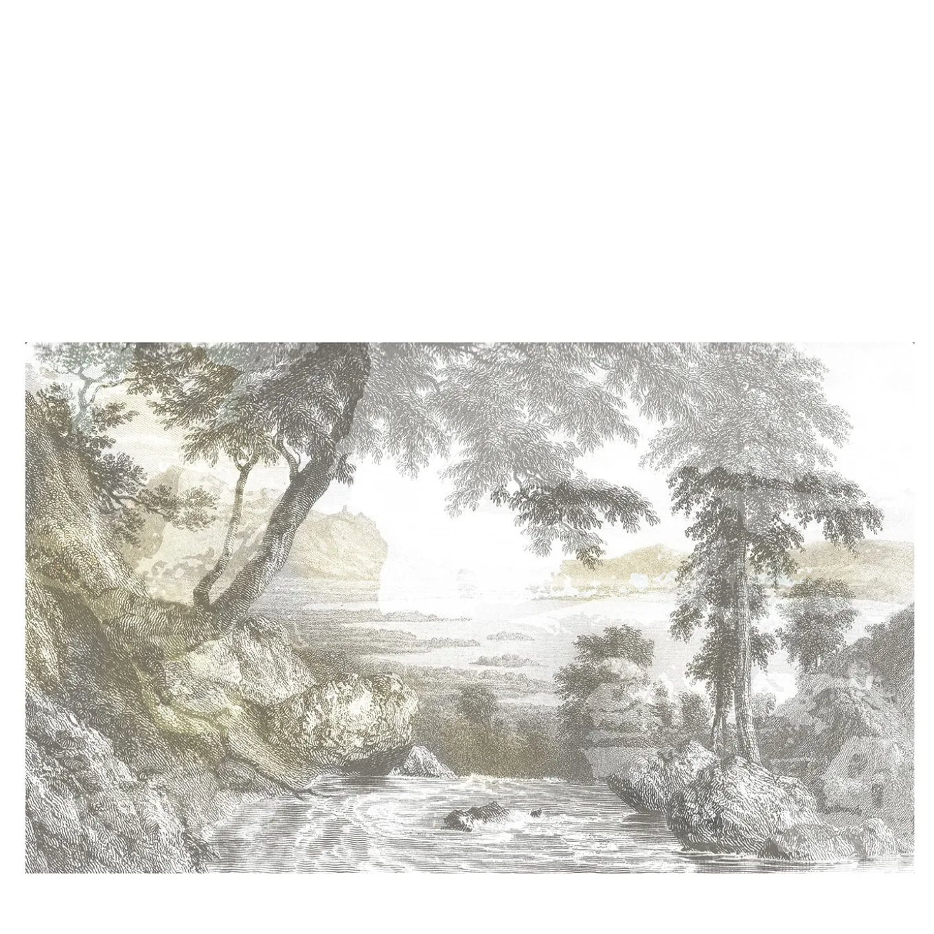 Dull tones contribute to stress the sophistication of this naturalistic-themed wallpaper in sustainable, PVC-free paper, superb design from the Panorama Collection including a variety of different landscapes inspired by the trompe l’oeil wallpapers popular in the early 20th century. Offered in multiple palettes and effects, the design sports a tranquil scene by the river. Can also be printed on thin Kerlite® or fiberglass panels upon request, please ask the Concierge for pricing. Price is per squared meter.