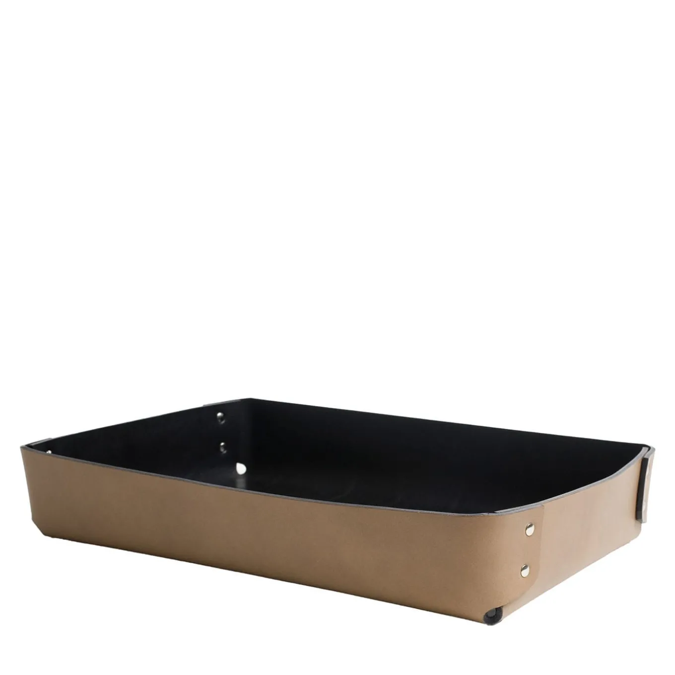 Exclusive solution for collecting documents on refined contemporary desks, this rectangular vide poche boasts a clean-lined silhouette obtained from the precise cutting and folding of a single fine leather sheet. Equipped with bright rivets at once fastening and adorning it, the tray allows for a variety of color combinations thanks to its double-layer design. Please contact the Concierge for details on wide variety of available color variants.