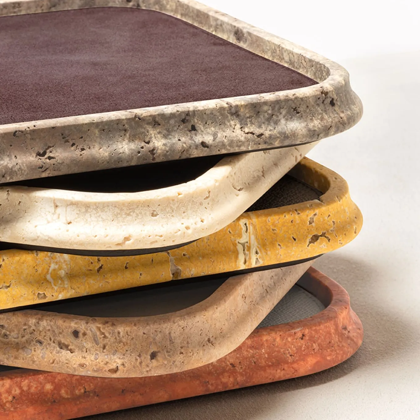 The essential lines and soft volumes of this collection fully enhances the beauty of travertine. Available in several nuances of choice, and provided with removable leather placemats, the Rodi boxes play with solids and voids, light contrasts, and color matches. Custom sizes are available on request. Travertino finishes available: Travertino Classic, Travertino Walnut, Travertino Titanium, Travertino Yellow, Travertino Red.