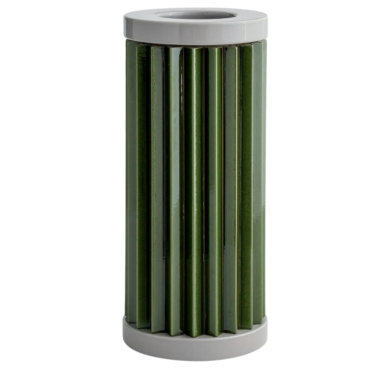 This unique vase designed by Ronan & Erwan Bouroullec and handcrafted of ceramic in collaboration with Bitossi combines traditional craftsmanship with an elegant contemporary aesthetic. Part of the exclusive Rombini series, it is rendered in glossy gray and green hues. Also available in a wide range of colors and compositions, please consult the Artemest catalog for options.