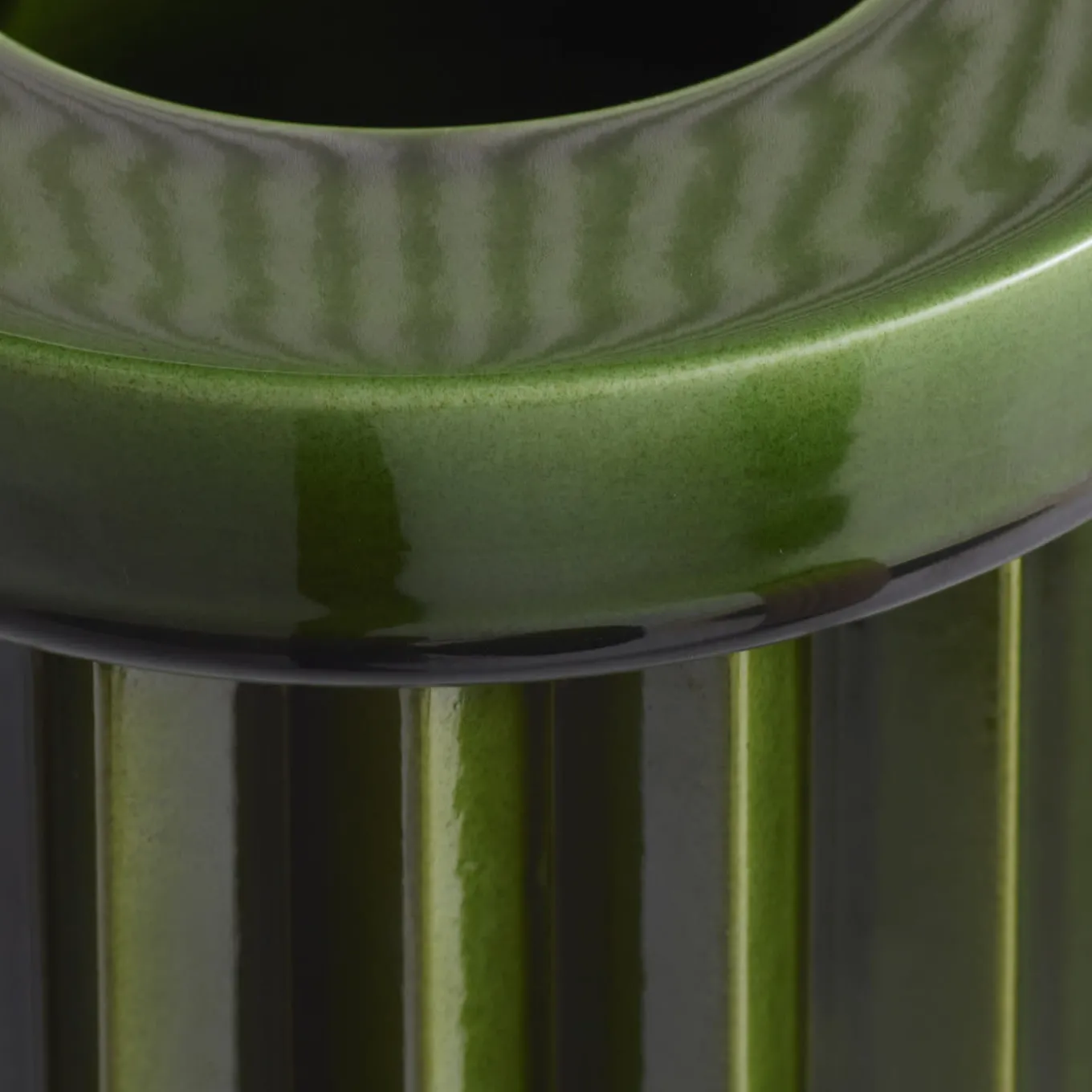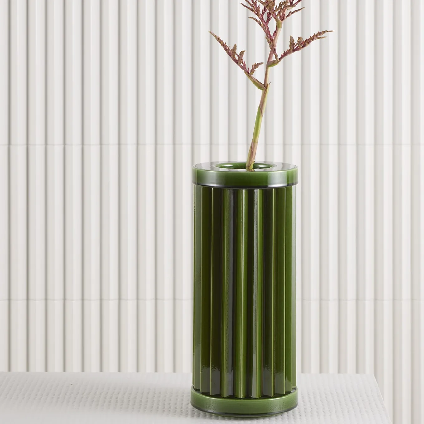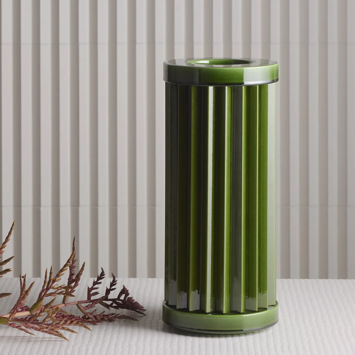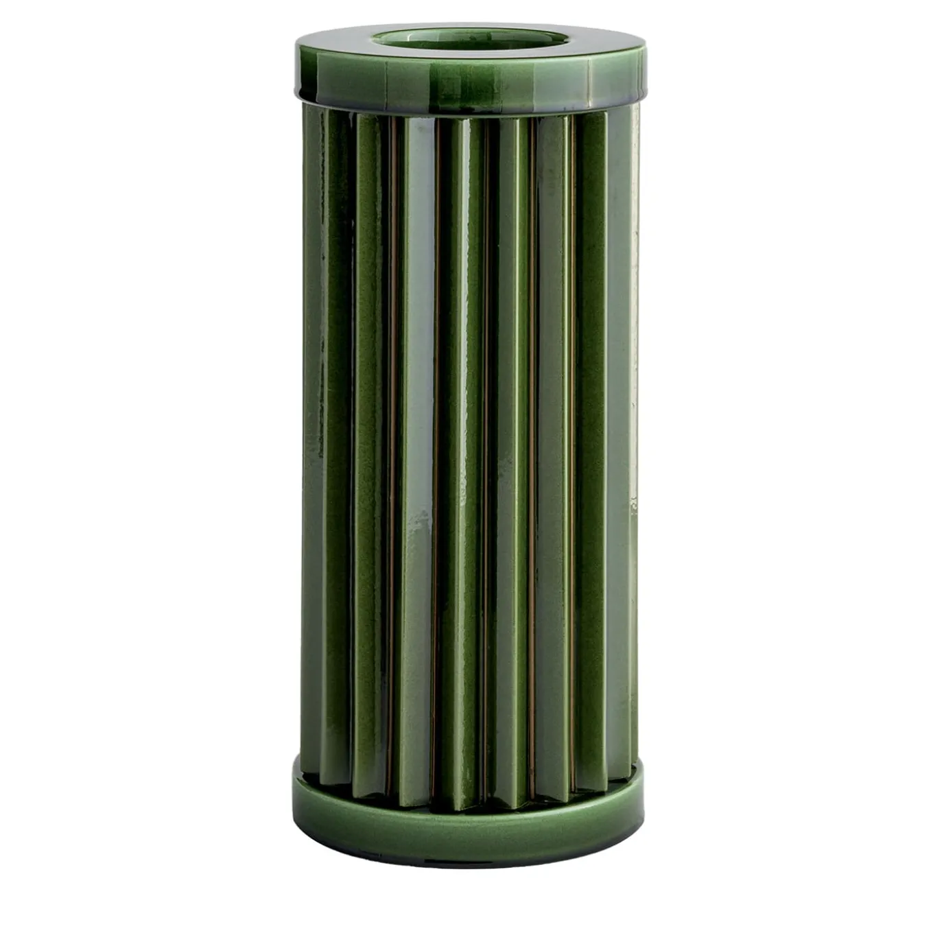 A unique and sophisticated design of elegant and timeless architectural value, this vase belongs to the Rombini series of sculptural vases designed by Ronan & Erwan Bouroullec and handcrafted of ceramic in collaboration with Bitossi. Finished by hand in a total green shade of polished flair, enhancing its pleated cylindrical shape. Available in a wide range of colors and compositions, please consult the Artemest catalog for options.