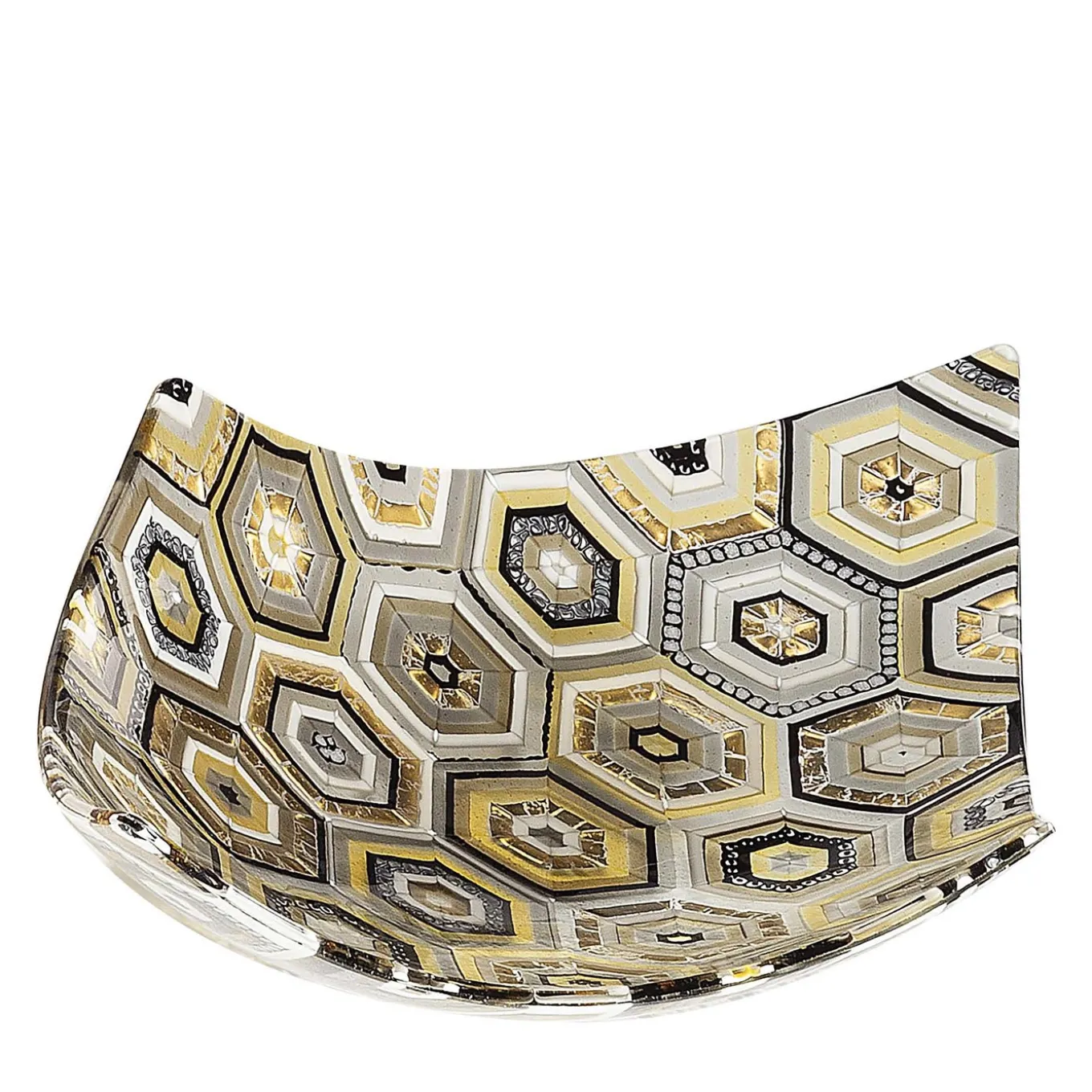 Elegantly crafted centerpiece featuring an original hexagonal shape with decorative maiolica patterns fused with smoky gray glass tones, enhanced by gold leaf and venetian murrine accents. Its geometric and chromatic design evokes the image of kites soaring in the wind. The complex creation process involves careful color sequencing and precise shaping, resulting in a distinct piece for lovers of traditional, classic style. Dimensions may slightly vary due to artisanal production.
